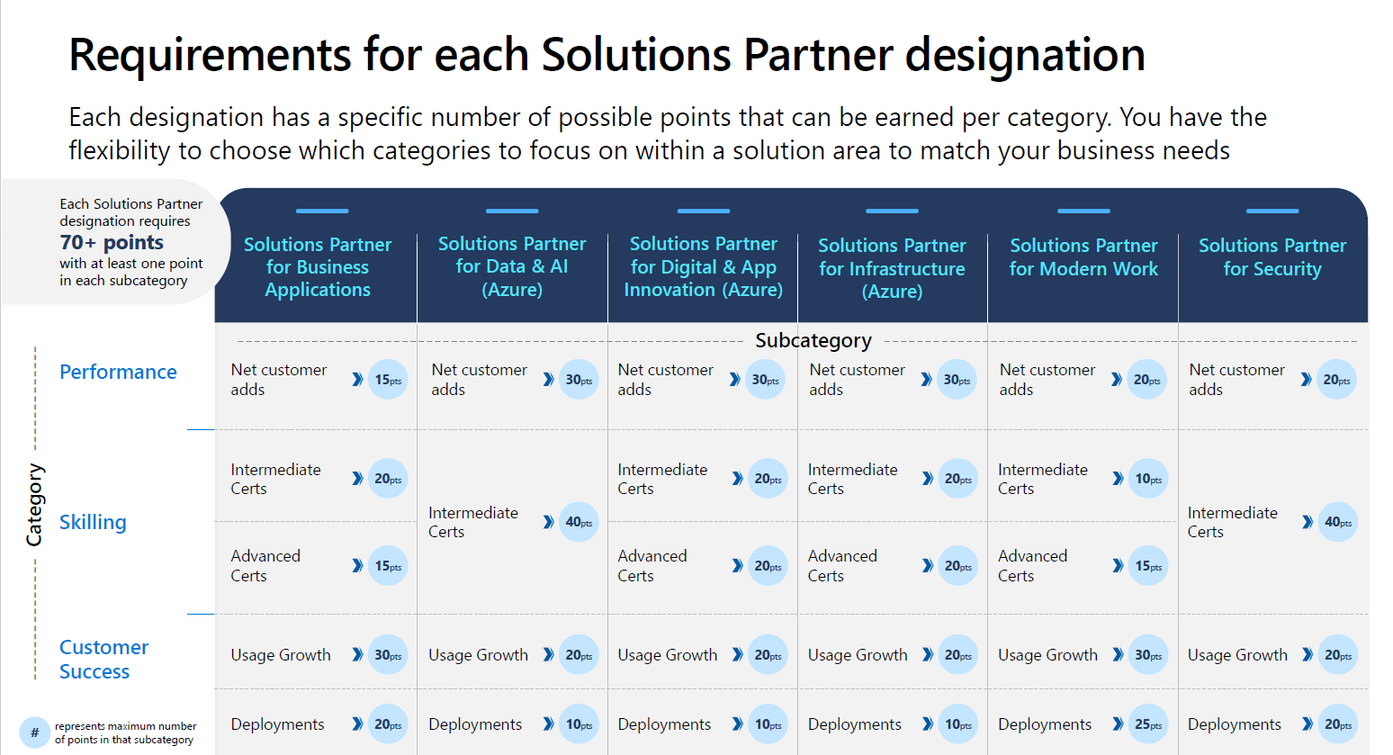 一部のソリューション領域には、成長戦略を持つさまざまなパートナーがいて、さまざまな規模のお客様と協力しています。 これらのソリューション分野(データ&AI、デジタル&アプリイノベーション、インフラストラクチャ、モダンワーク、ビジネスアプリケーション)では、複数のトラックを作成し、各トラックには、ソリューションパートナーの指定を受けるためのポイントを獲得するための異なるしきい値が設定されています。