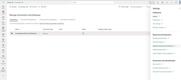 - 接続とゲートウェイの管理にアクセスし、Dataverse 接続を見つけるには、スイッチからワークスペース ID 認証への切り替えから手順 1 から 2 に従います。