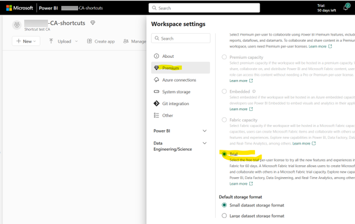 - 必要なプレミアム容量にアクセスできるかどうかを確認するには、 Power BI に移動してワークスペースを開き、 ワークスペース設定>Premium を選択します。