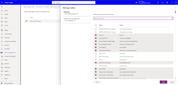 環境が Dynamics 365 Finance and Operations 環境にリンクされている場合は、テーブルの追加オプションを使用して財務と運用アプリのテーブルを含めることができます。 詳細情報: Dataverse への Azure Synapse リンクで財務と運用データを選択する