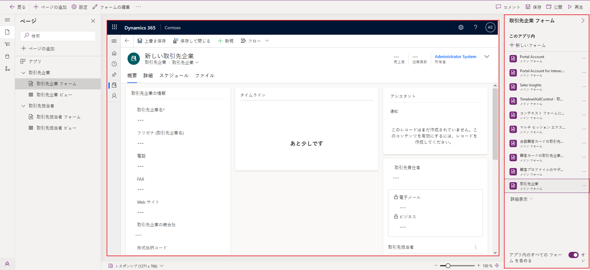 アカウント フォームなどのコンポーネントを選択すると、プレビューとプロパティペインに表示される内容に影響します。 表示にアクセスできるデータが環境に含まれている場合は、プレビューにも表示されます。