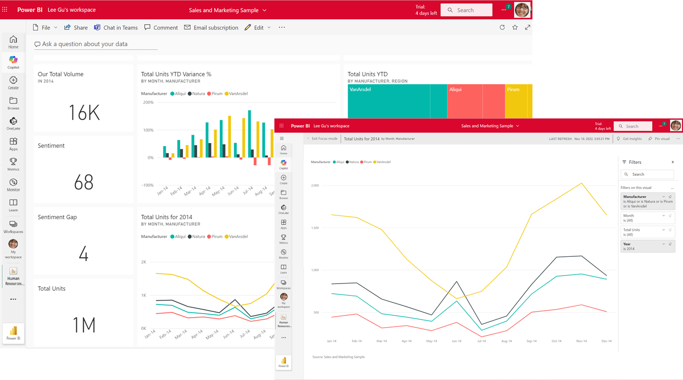 "フォーカス" モードでは、ビジュアルまたはタイルを拡大 (ポップアウト) し、詳細を確認することができます。 ダッシュボードやレポートが少し混み合っていて、1 つのビジュアルだけを拡大して見たいことがあるでしょう。 この機能は、フォーカス モードを使用するのに最適です。