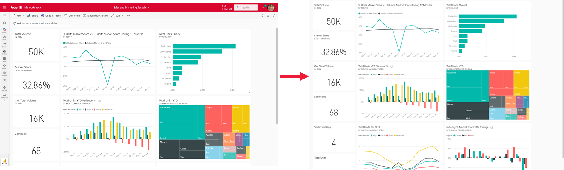 フォーカス モードと全画面表示モードは、ビジュアル、レポート、ダッシュボードで詳細を表示する 2 つの方法です。 全画面表示モードはレポート キャンバスまたはダッシュボードの現在のコンテンツに適用されます。 コンテンツを囲むウィンドウが全部取り除かれます。 フォーカス モードは個々のレポート ビジュアルまたはダッシュボード タイルに適用されます。 フィルター、メニュー、ナビゲーション ウィンドウと共にタイルまたはビジュアルを拡大します。 類似点と相違点について詳しく見てみましょう。