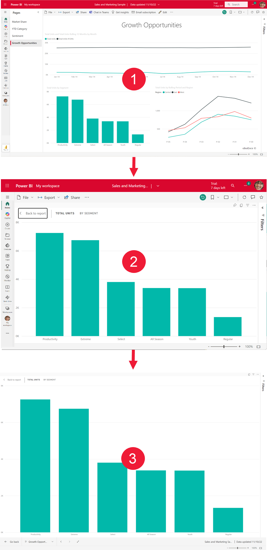 次の例では、レポート (1) から始め、フォーカス モード (2) で視覚化の 1 つを開き、同じ視覚化を全画面表示モード (3) で開きました。