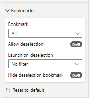 選択されていない状態をブックマークした後、[ 選択解除を許可] をオンにします。 選択解除時に起動の設定で、ナビゲーターでブックマークが選択されていない場合に移動するブックマークを選択してください。 次のスクリーンショットでは、そのブックマークの名前は [フィルターなし] です。 選択解除に使用するブックマークをブックマーク ナビゲーターに表示しない場合は、[ 選択解除ブックマークを非表示にする] を選択します。