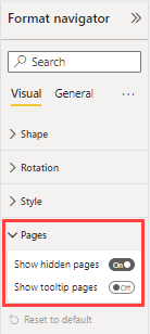 ページ ナビゲーターに表示されるページや非表示になっているページをさらにカスタマイズする場合は、[ ナビゲーターの書式設定 ] ウィンドウに移動します。 [ ページ] で、非表示のページとヒント ページを表示するための設定を調整します。