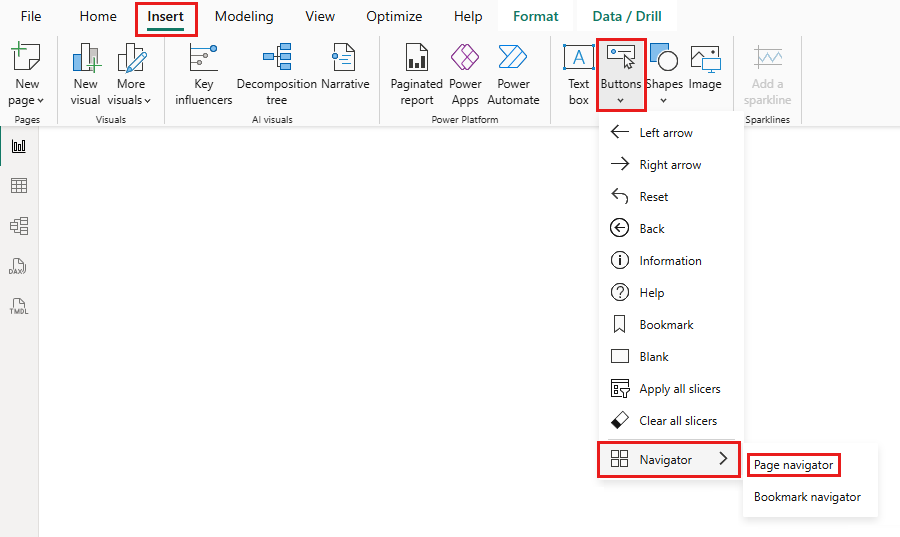 [ページ ナビゲーター] を選択すると、Power BI によってページ ナビゲーターが自動的に作成されます。