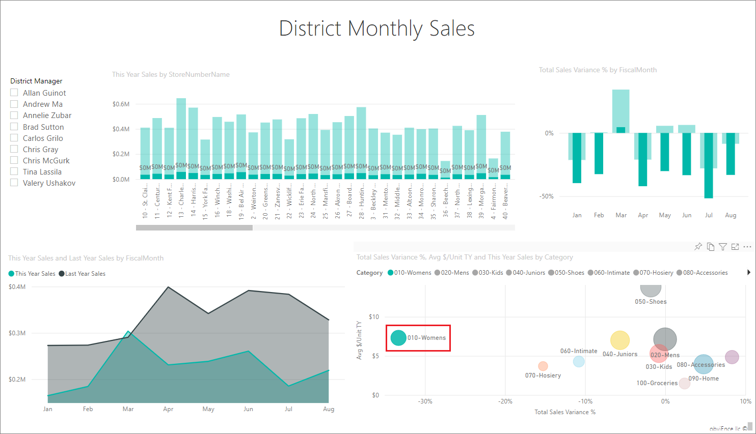 ダッシュボードで、[ 今年の売上] の [昨年の売上] タイルを選択すると、レポートの [District Monthly Sales]\(地区の月次売上\) ページが開きます。