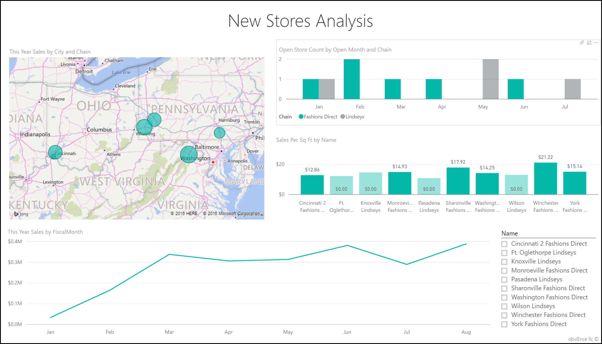 Open Store Count by Open Month and Chain の右上のグラフで、Fashions Direct の凡例項目を選択します。 同じチェーンであっても、最高の店 (Winchester Fashions Direct) は、それぞれ $21.22 と $12.86 の間で最悪の店舗 (シンシナティ 2 ファッション ダイレクト) を大幅に上回っています。