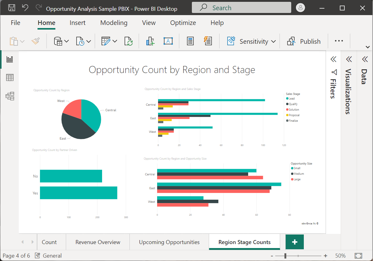 営業案件の分析のサンプル .pbix ファイルをレポート ビューで開きます。