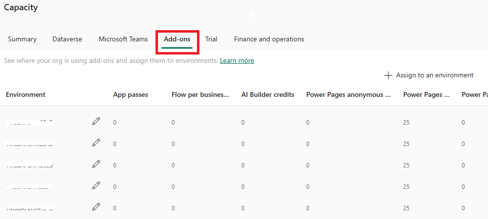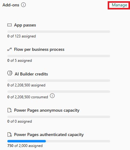 アドオンを割り当てるには、管理するを選択します。 詳細については、環境内のキャパシティの割り当てまたは変更を参照してください。