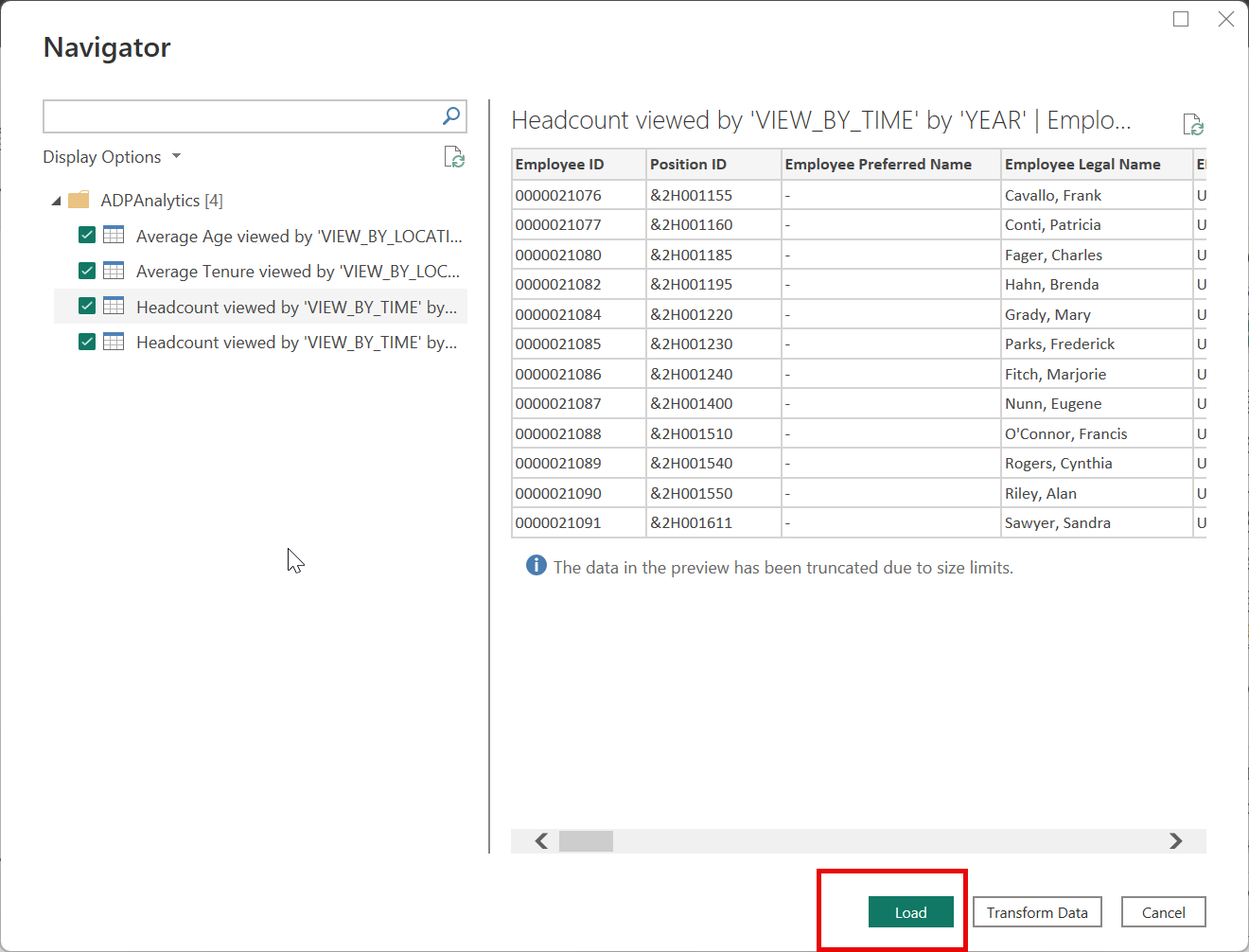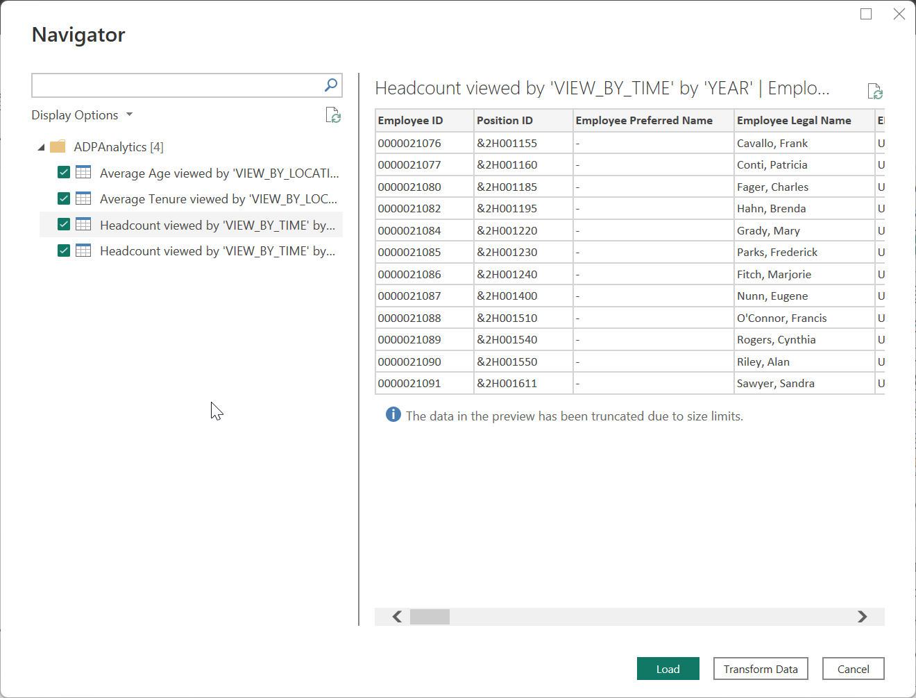 接続が確立されたら、power BI にインポートする ナビゲーター ダイアログ内で、選択したメトリックのメトリック詳細テーブルまたは従業員詳細テーブルをプレビューして選択できます。