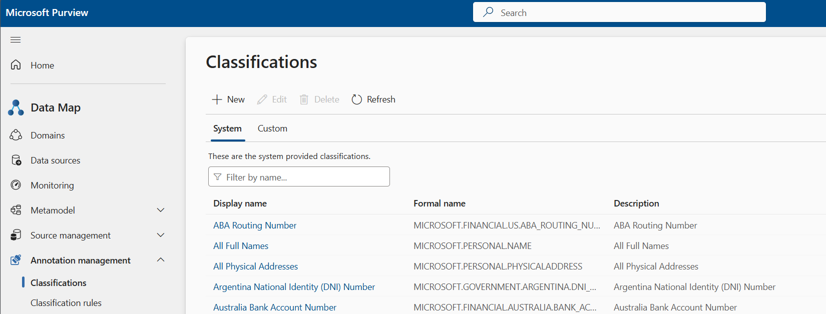 スキャンするデータ資産に適用する使用可能なシステム分類を確認します。 システム分類の正式な名前には、 MICROSOFT プレフィックスがあります。