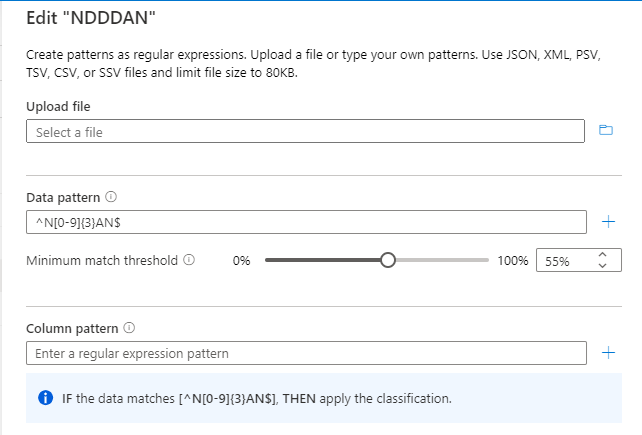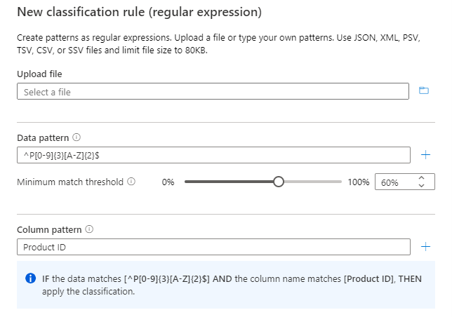 分類を適用するために、データ パターンに一致するデータに許容される最小一致 しきい値 パラメーターを構成します。 しきい値は、1% から 100% までです。 誤検知を回避するために、しきい値として 60% 以上の値を指定することをお勧めします。 ただし、特定の分類シナリオに必要に応じて構成することもできます。 たとえば、パターンに一致する場合、データ内の任意の値の分類を検出して適用する場合、しきい値は 1% まで低くなる可能性があります。