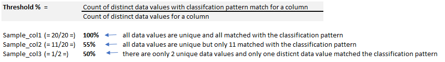 個別のデータしきい値: これは、スキャナーがデータ パターンを実行する前に列で検出する必要がある個別のデータ値の合計数です。 個別のデータしきい値はパターン マッチングとは関係ありませんが、パターン マッチングの前提条件です。 システム分類ルールでは、各列に少なくとも 8 つの個別の値が含まれる必要があります。 この値は、スキャナーが正確に分類するのに十分なデータが列に含まれていることを確認するために必要です。 たとえば、値 1 を含む複数の行を含む列は分類されません。 値を持つ行が 1 つ含まれており、残りの行に null 値がある列も分類されません。 複数のパターンを指定した場合、この値はそれぞれのパターンに適用されます。