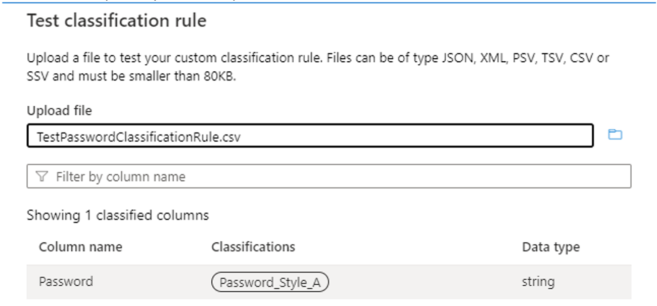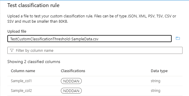 分類ルールのテストとサンプル データのテストを使用して、分類ルールが期待どおりに動作していることを確認します。 サンプル データ (たとえば、.csv ファイル内) に、分類を適用する列を含む少なくとも 3 つの列が存在することを確認します。 テストが成功した場合は、次の図に示すように、列に分類ラベルが表示されます。