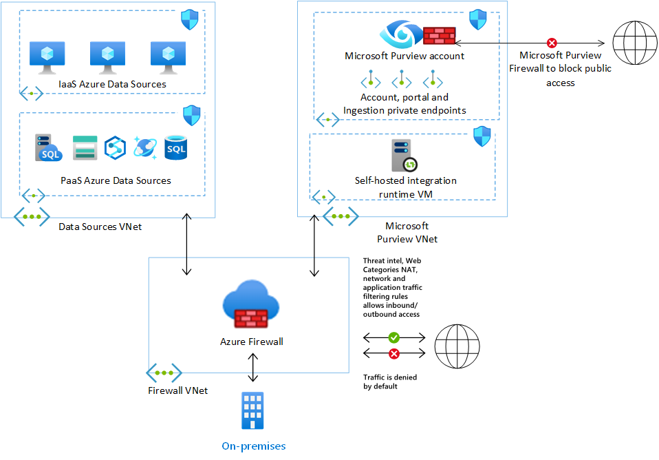 - ネットワーク検査やネットワーク フィルタリングのAzure Firewallなど、ネットワーク仮想アプライアンスによって管理されるプライベート エンドポイントを使用して Microsoft Purview を実装します。