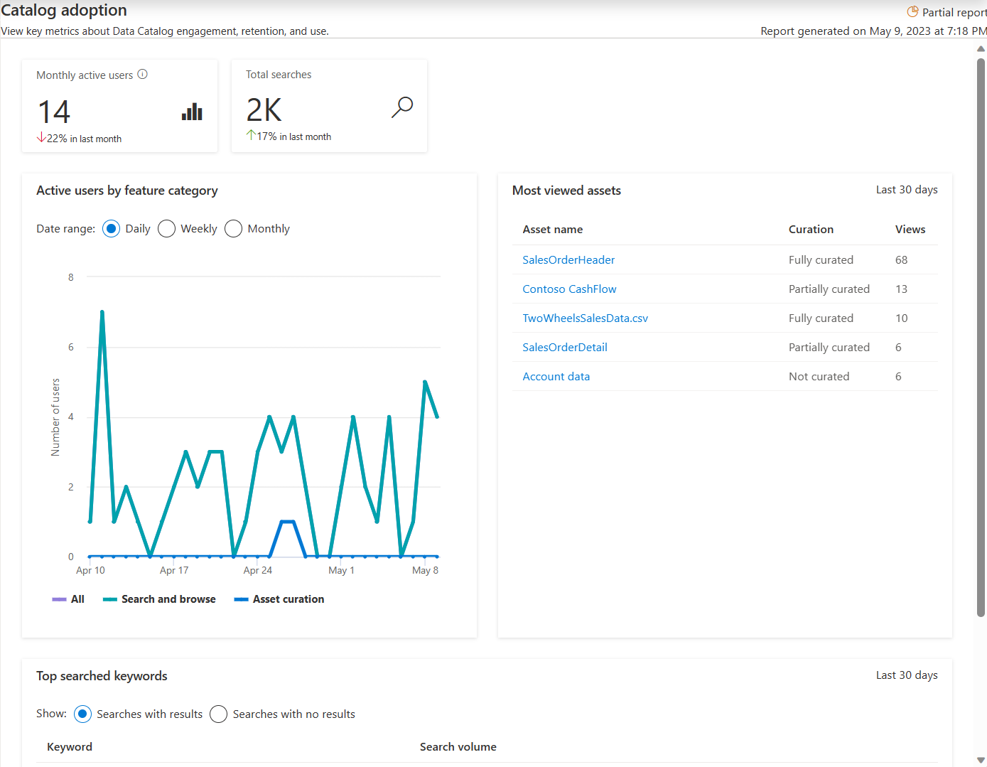 上位の検索キーワード テーブルには、検索結果を生成した検索と、検索されなかった検索の両方について、上位のキーワードが表示されます。 そうすることで、ユーザーがカタログで見つけている内容と、まだ探しているものを知ることができます。
