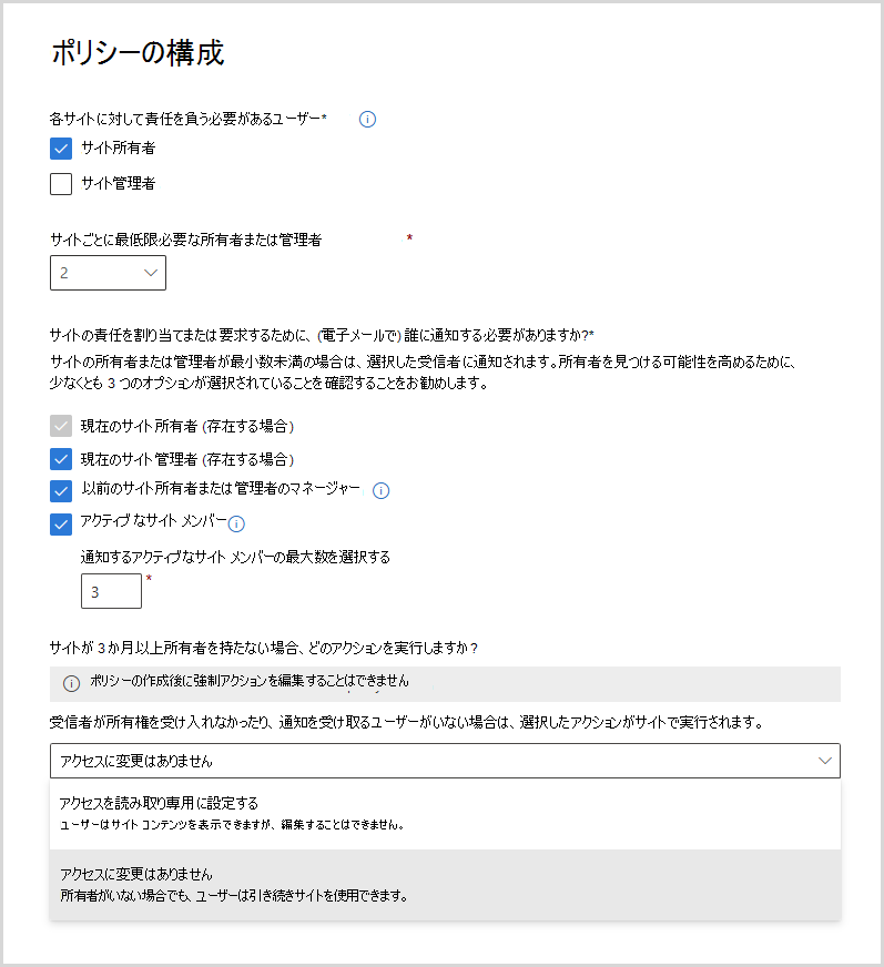 アクティブ なサイト メンバー: ポリシーの構成に基づいて、所有権を受け入れるために、サイトの最新のアクティブなメンバーに電子メールが送信されます。