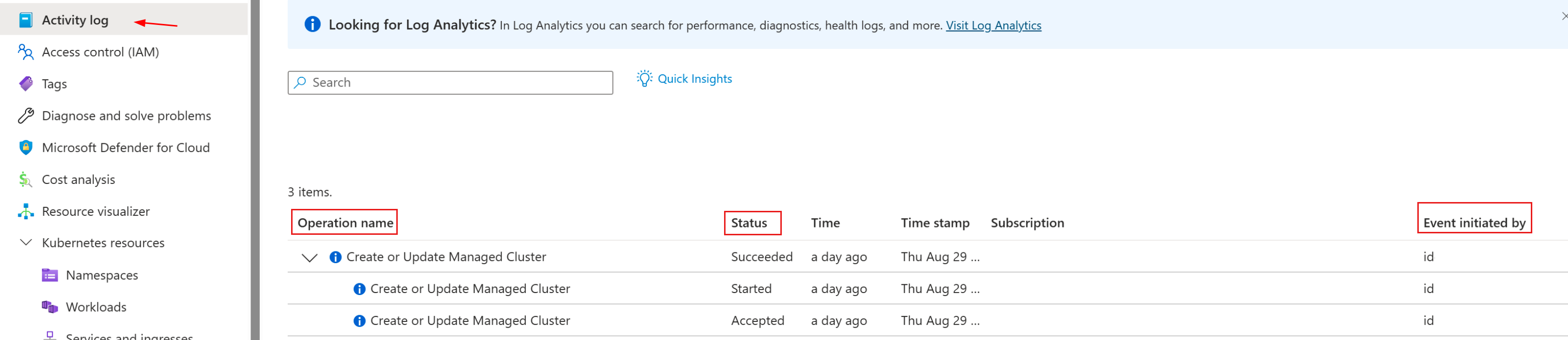 Activity Log ページで、Operation name 列に Create または Update Managed Cluster が表示されているログ エントリを見つけます。