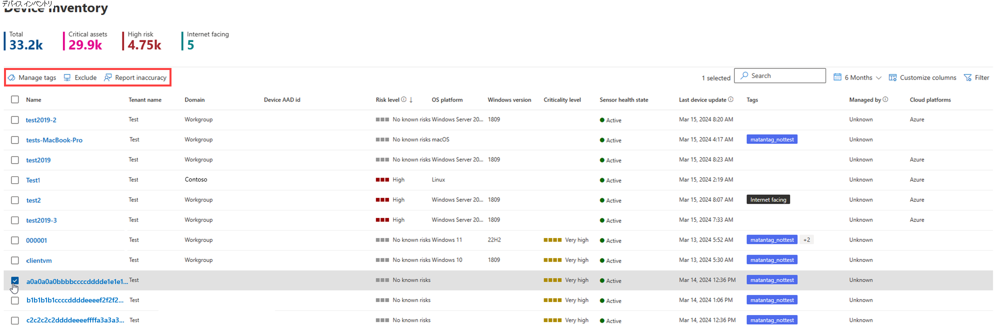 デバイスを管理するには、一覧から特定のデバイスを選択します。 タグの管理、デバイスの除外、レポートの不正確さなどのデバイス管理タスクは、デバイス一覧の上部で使用できるようになります。