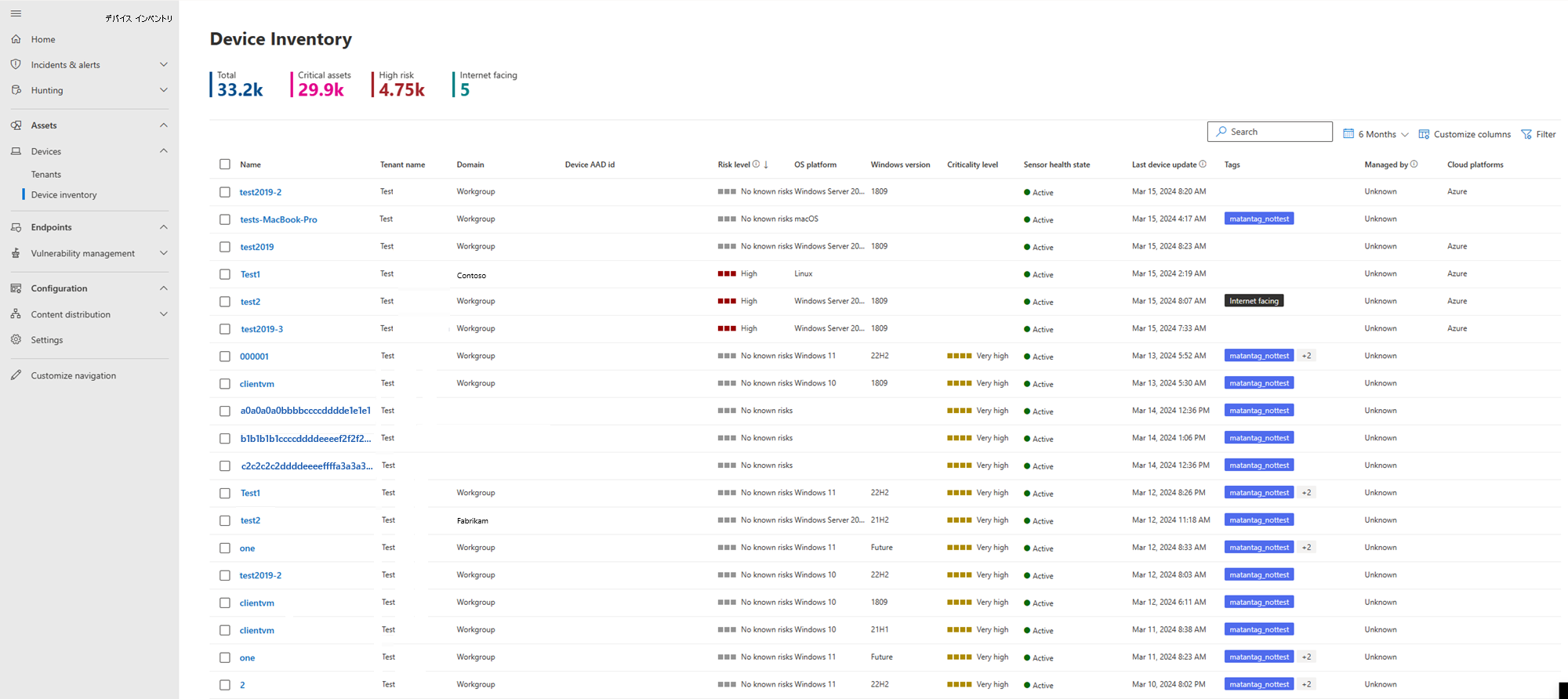 テナント名を選択して、すべてのデータとインベントリ関連のアクションを使用できるMicrosoft Defender XDR ポータルでそのテナントのデバイス インベントリに移動します。