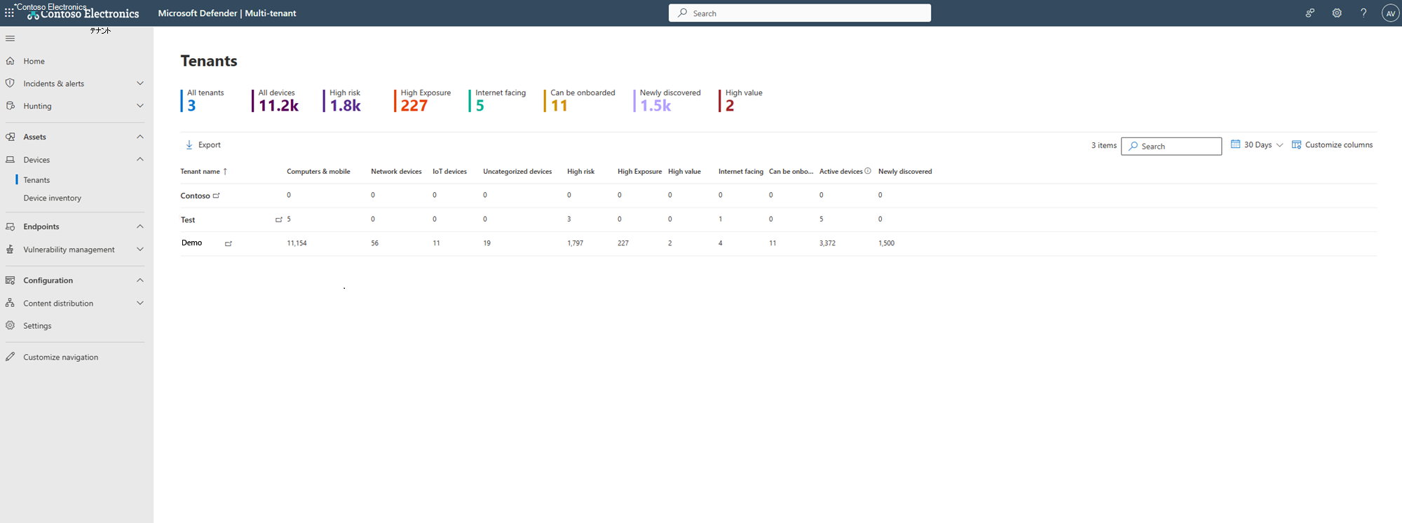 マルチテナント管理の [テナント] ページには、アクセスできる各テナントが一覧表示されます。 各テナント ページには、デバイスとデバイスの種類の数、価値の高い高露出デバイスの数、オンボードに使用できるデバイスの数などの詳細が含まれています。