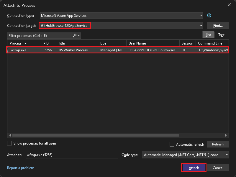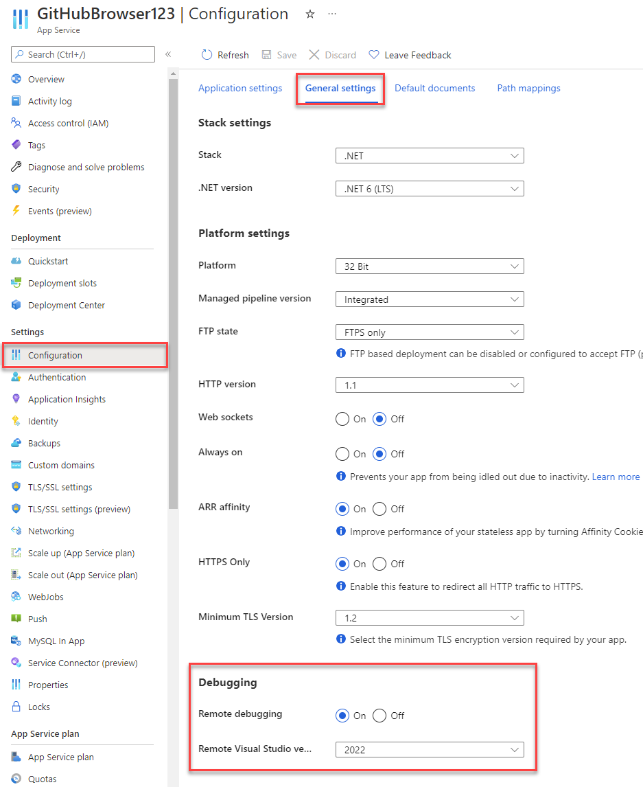Visual Studio でこの問題をデバッグするには、App Service でリモート デバッグ機能を有効にする必要があります。 この設定により、Visual Studio デバッガーはメインの App Service Web ホスティング プロセスに接続できます。