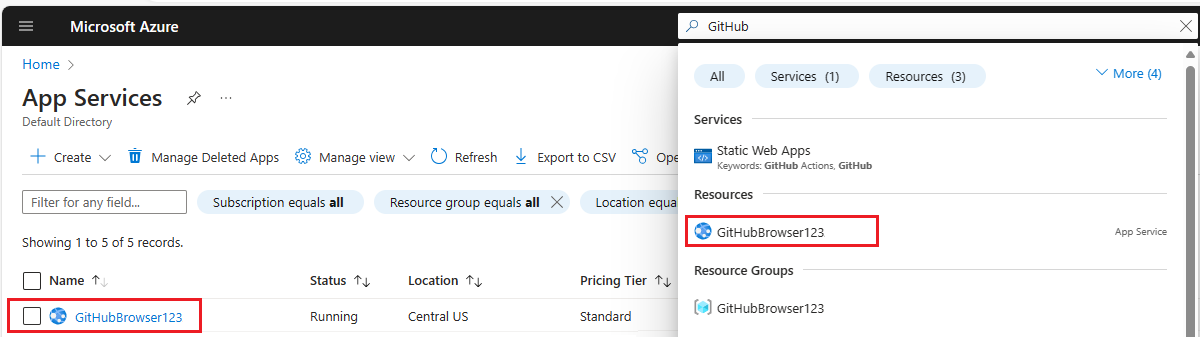 Azure portal でデプロイされたアプリケーションを見つけます。 App Services ページを参照し、 App Service インスタンスを選択すると、アプリを見つけることができます。 上部の検索バーで、名前で直接 App Service インスタンスを検索することもできます。 (この例では、App Service インスタンスの名前は GitHubBrowser123 です)。