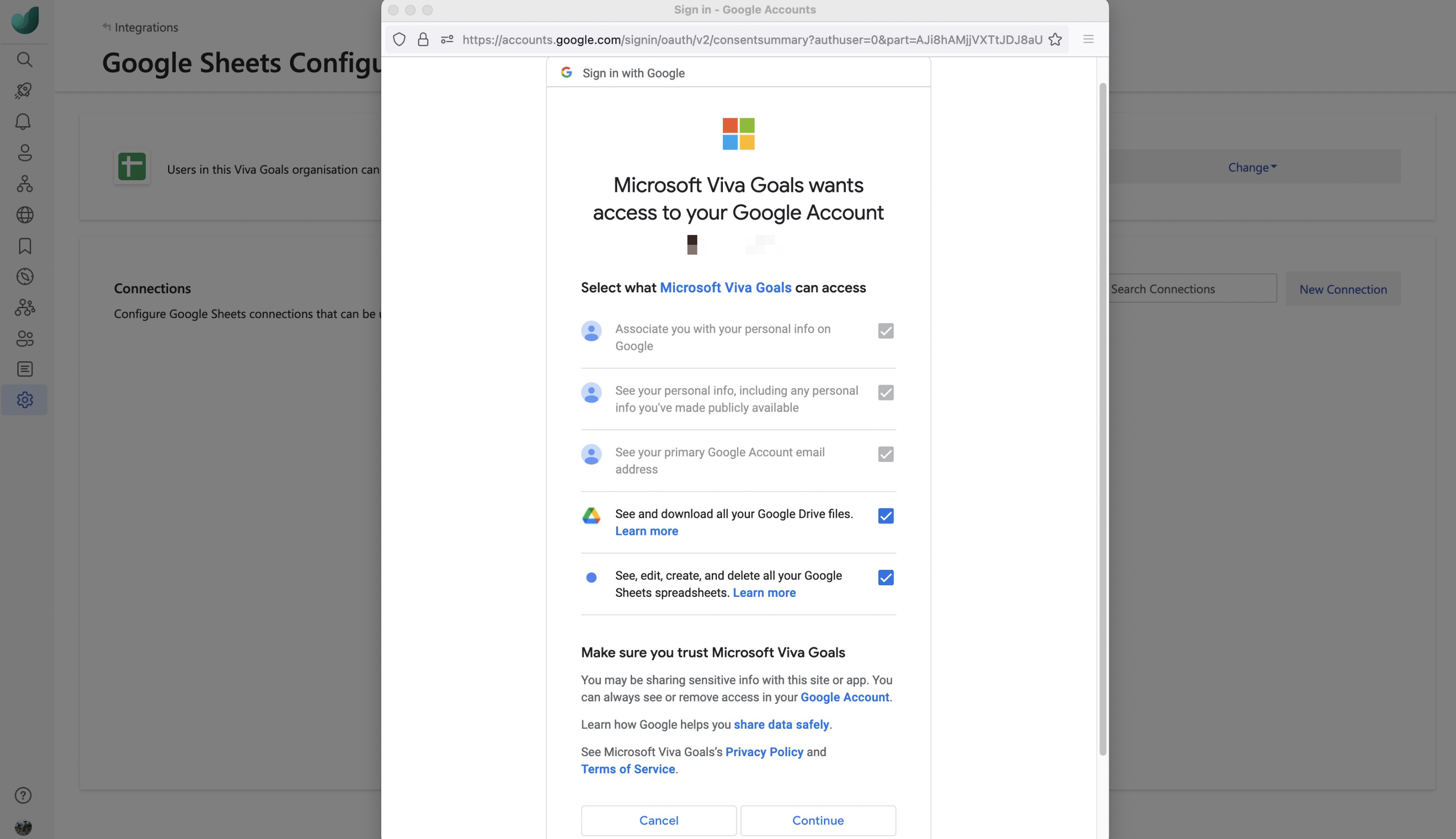 Google スプレッドシートにはドライブ ファイルを読み取る詳細なスコープがないため、Viva Goals手順 3 で説明されているように拡張されたスコープにアクセスする必要があることに注意してください。 Viva Goalsは、Google ドライブまたは共有ドライブからファイルを読み取る以外に Google ドライブ ファイルを管理することはできません。