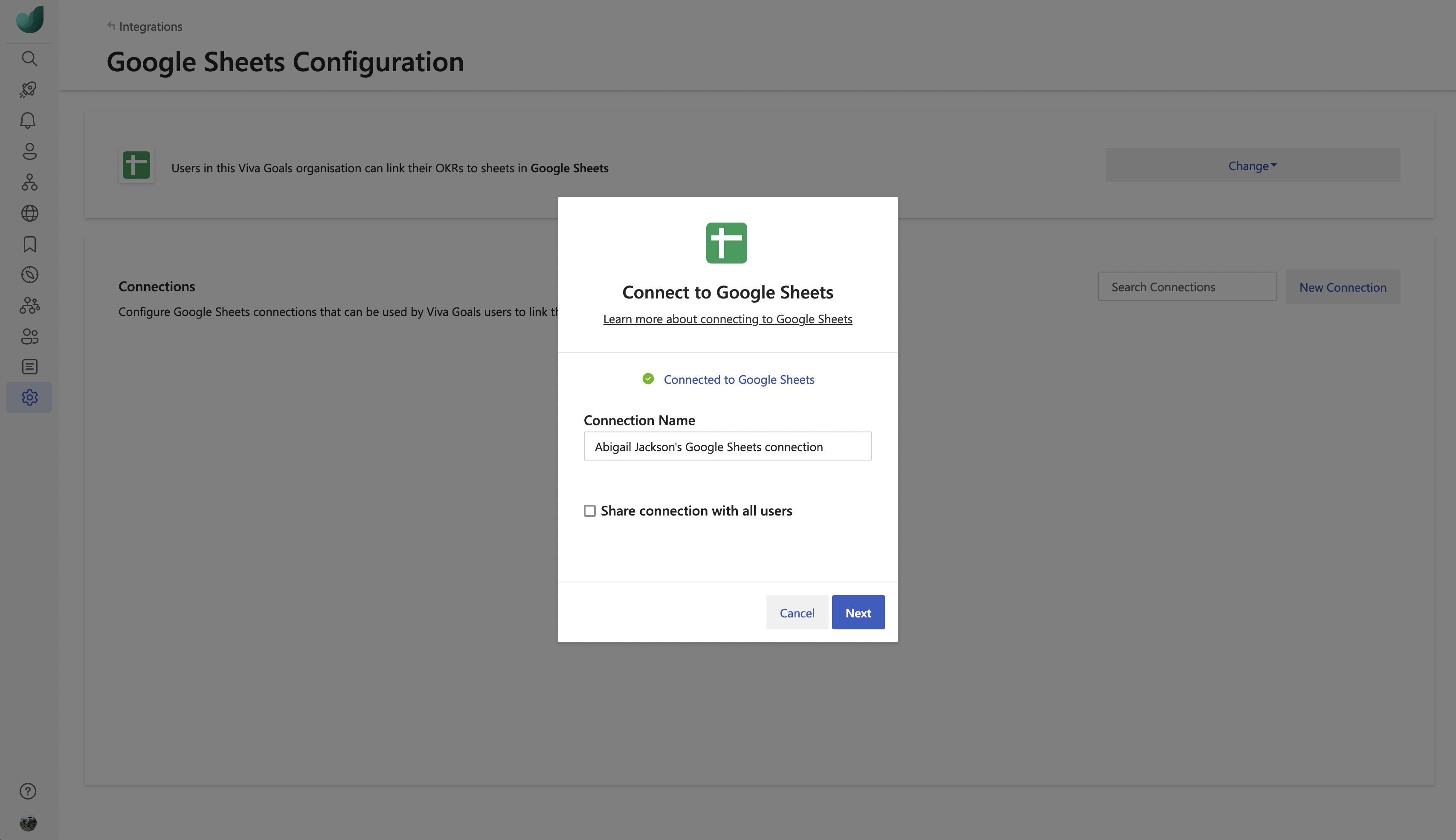 Viva Goalsを使用すると、複数の Google スプレッドシートに接続できます。 [ 新しい接続] を選択して、別のシートからデータをフェッチします。 これらの接続は名前で区別します。 名前は、OKR を Google スプレッドシート データにリンクすると、他のユーザーに表示されます。
