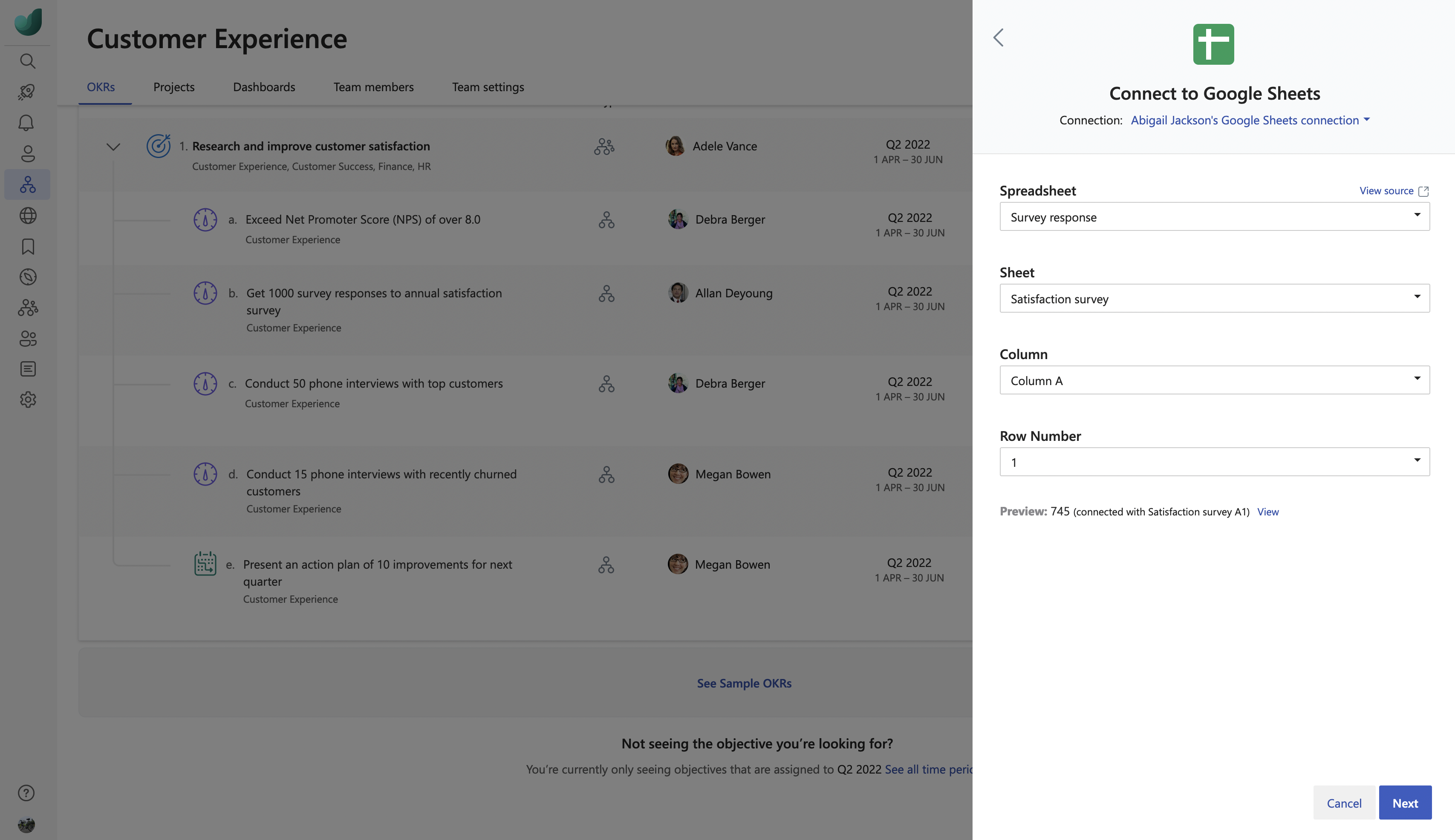 たとえば、アンケートの回答を追跡するために使用される Google シートがあるとします。 Google シート統合を実装することで、シート間を繰り返し行ったり来たりする手間を省き、VIVA GOALSで KR の進行状況を更新できます。Viva Goalsは値を同期するため、OKR を最新の状態に保ちながら時間を節約できます。