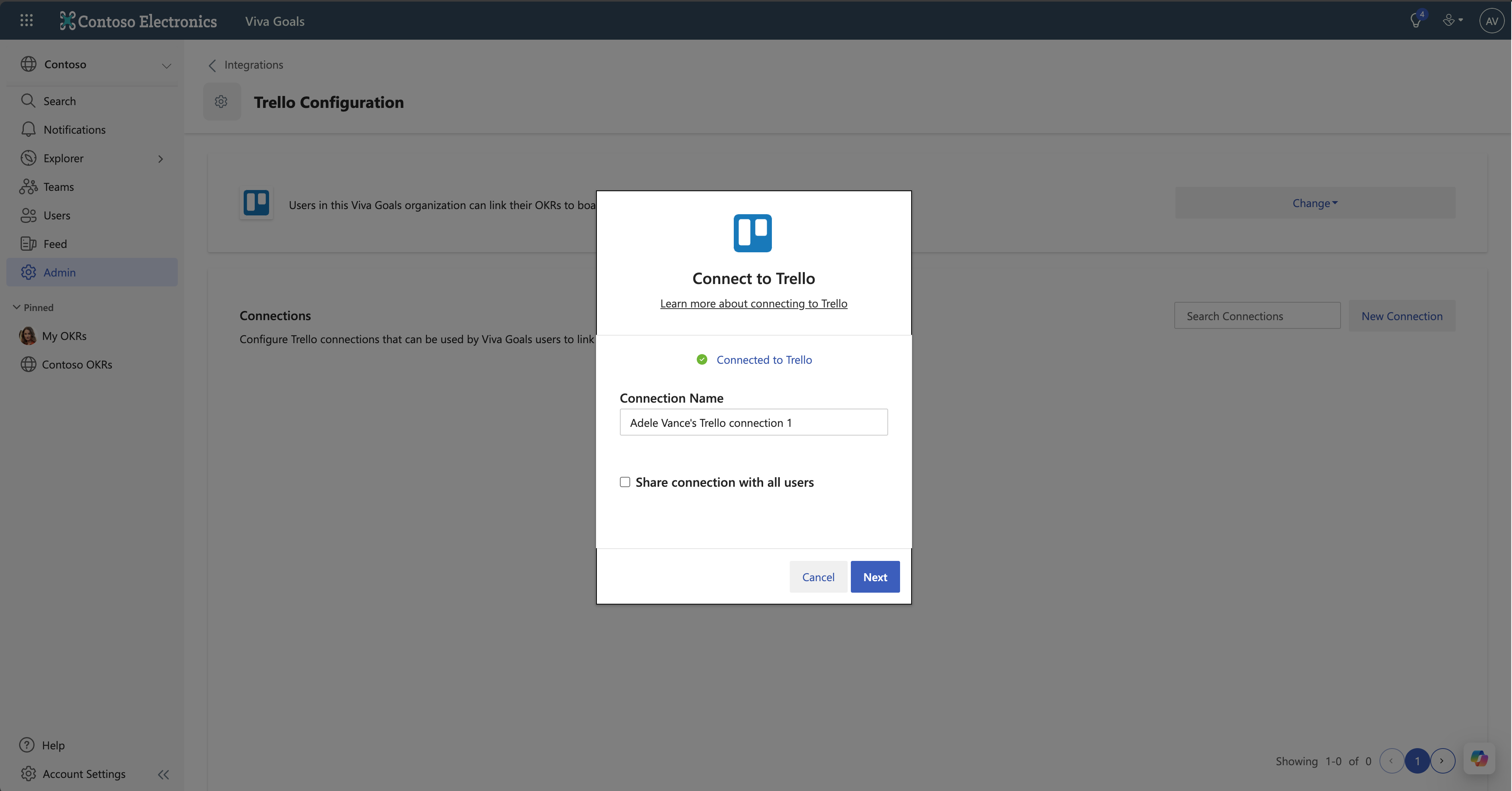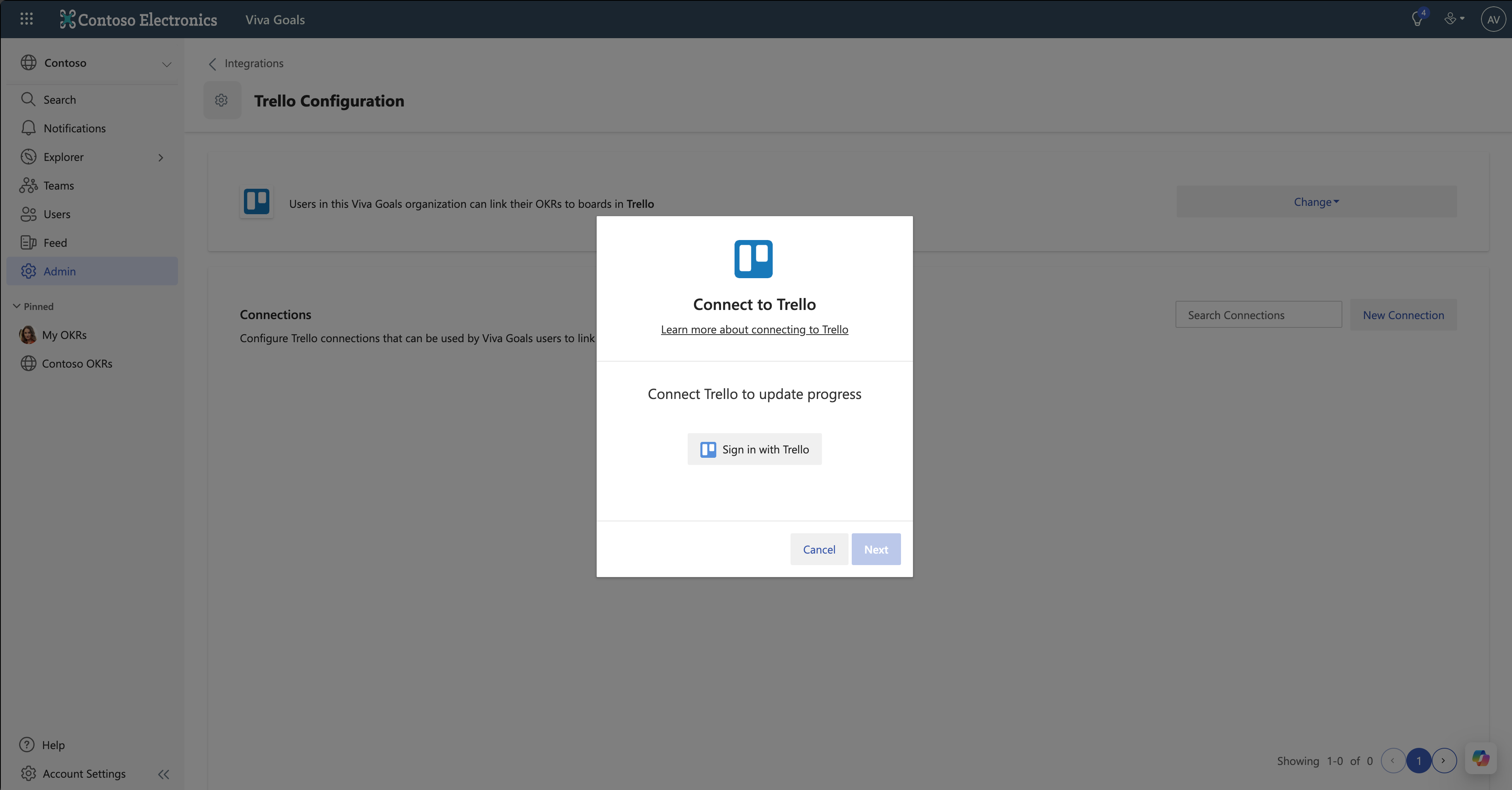 Trello 接続を既に作成しているか、organizationの管理者が共有している場合は、その接続が自動的に選択されます。 既存の接続にアクセスできない場合は、Viva Goals新しい接続を追加するように求められます。