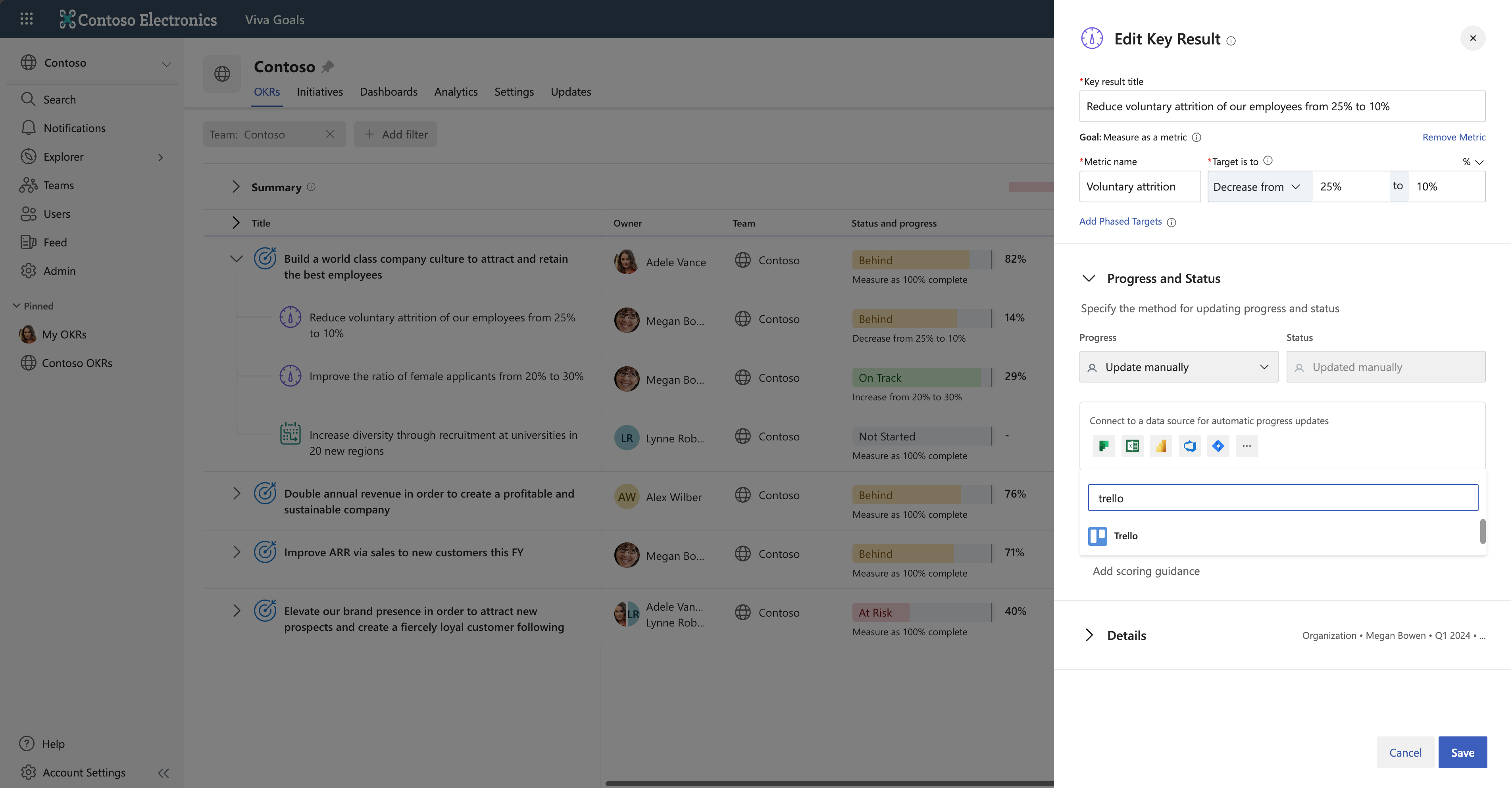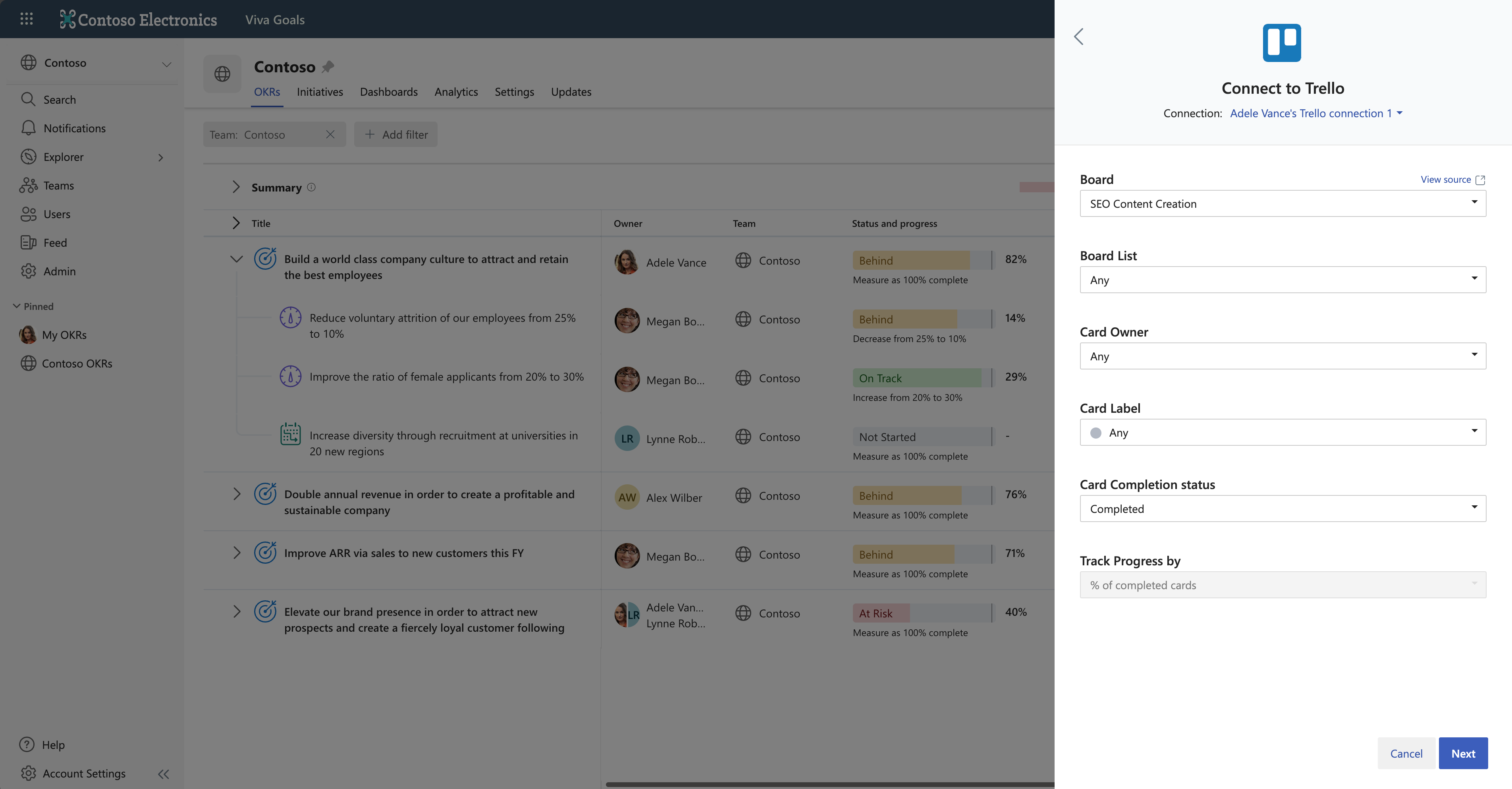 Viva Goals Trello ボードと統合して、キーの結果をViva Goalsで自動的に更新できます。 たとえば、Trello ボードを使用して公開するブログ投稿を追跡するマーケティング担当者とします。 Trello と統合すると、Viva Goals内から完了した投稿を簡単に追跡できます。