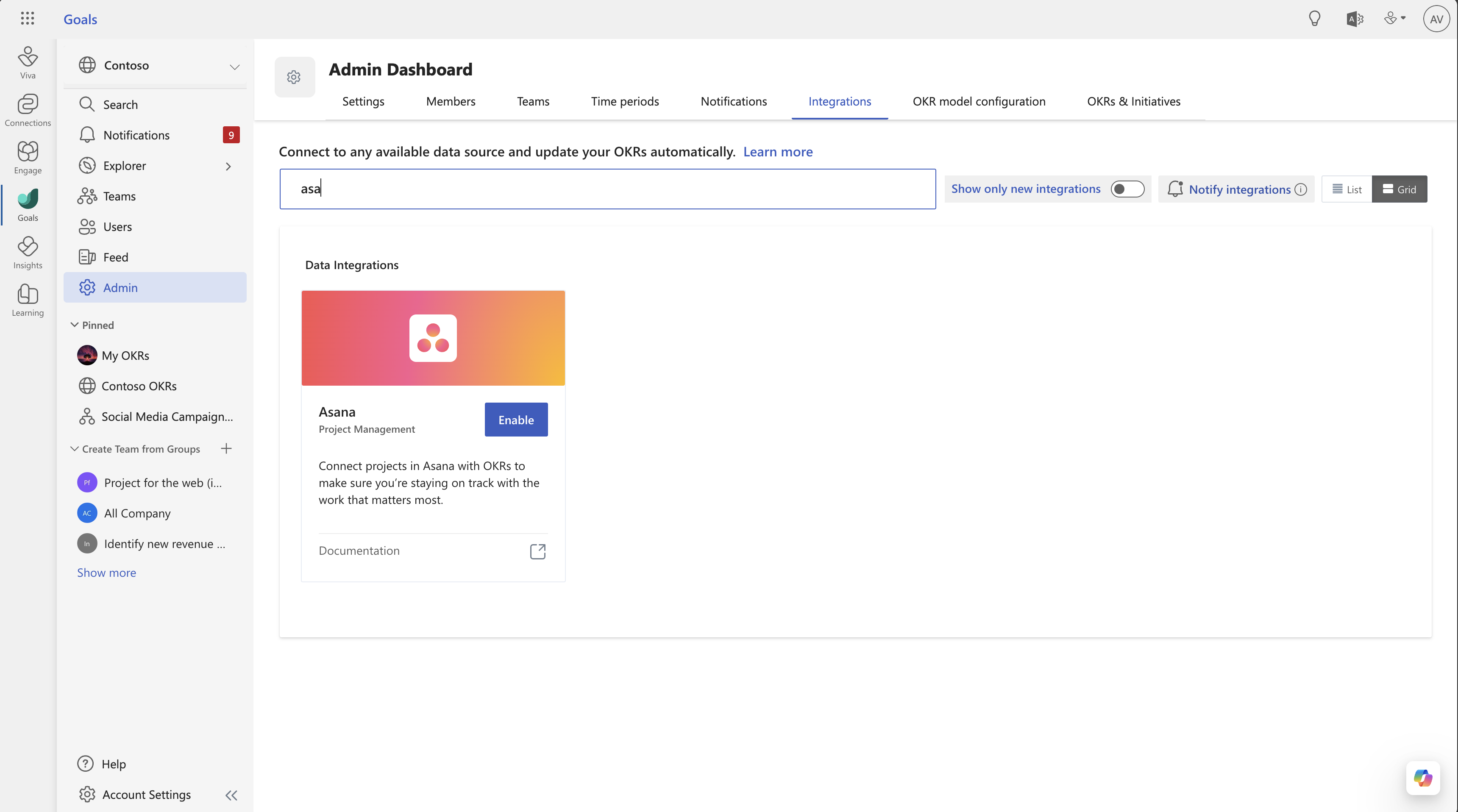 [Viva Goals統合] ページに移動します:管理>Integrations。
