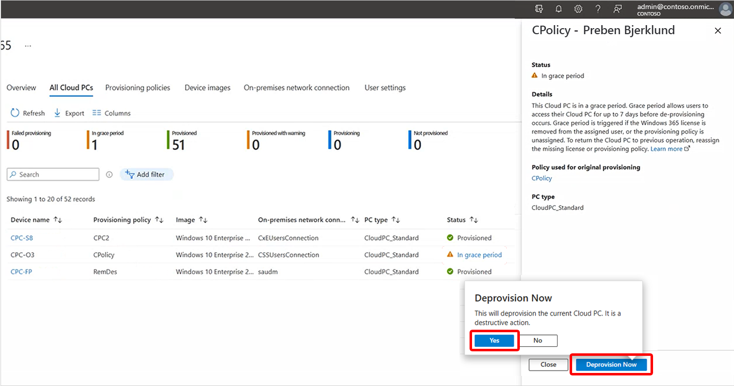一覧の [状態] 列で、[猶予期間>Deprovision now>Yes] を選択します。