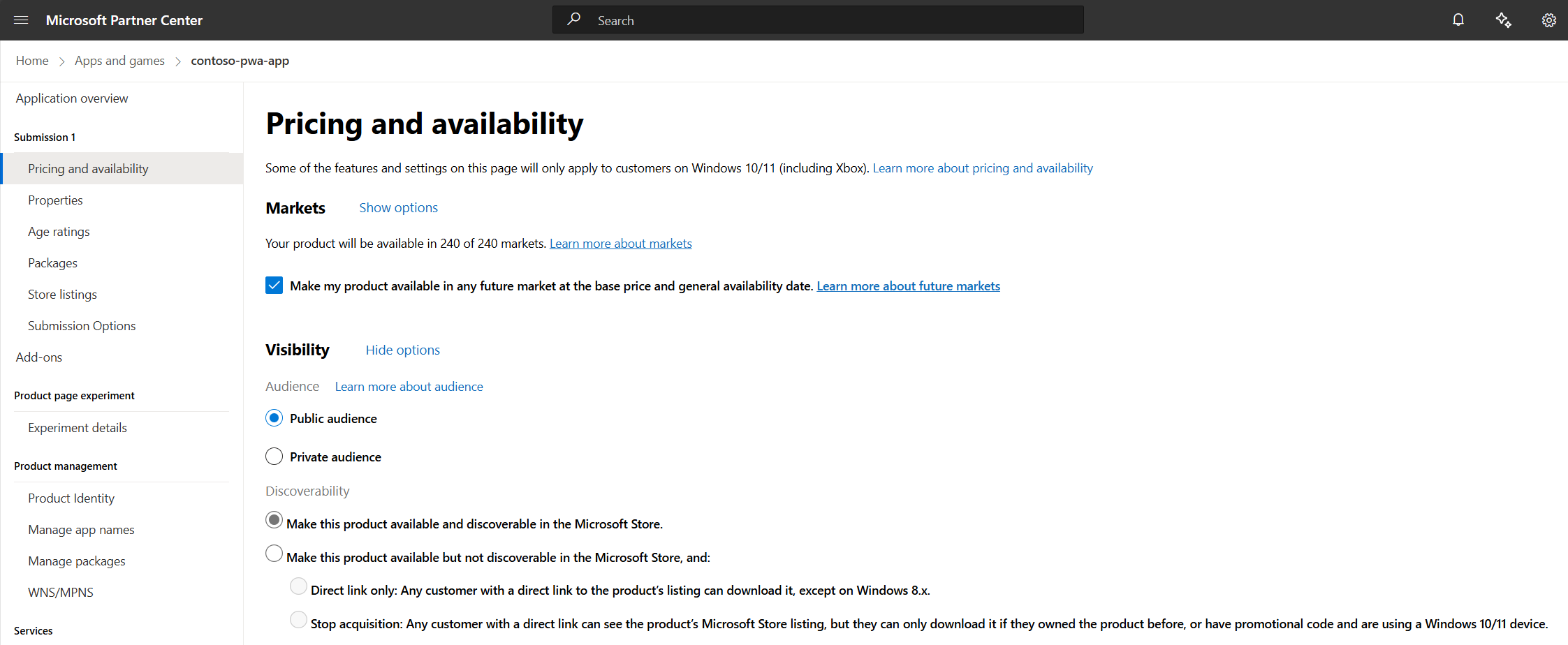 Microsoft Store は、世界中の 240 以上の国と地域のお客様が利用できます。 デフォルトでは、すべての可能な市場であなたのアプリを提供する。 必要に応じて、アプリを提供する特定の市場を選択することができる。