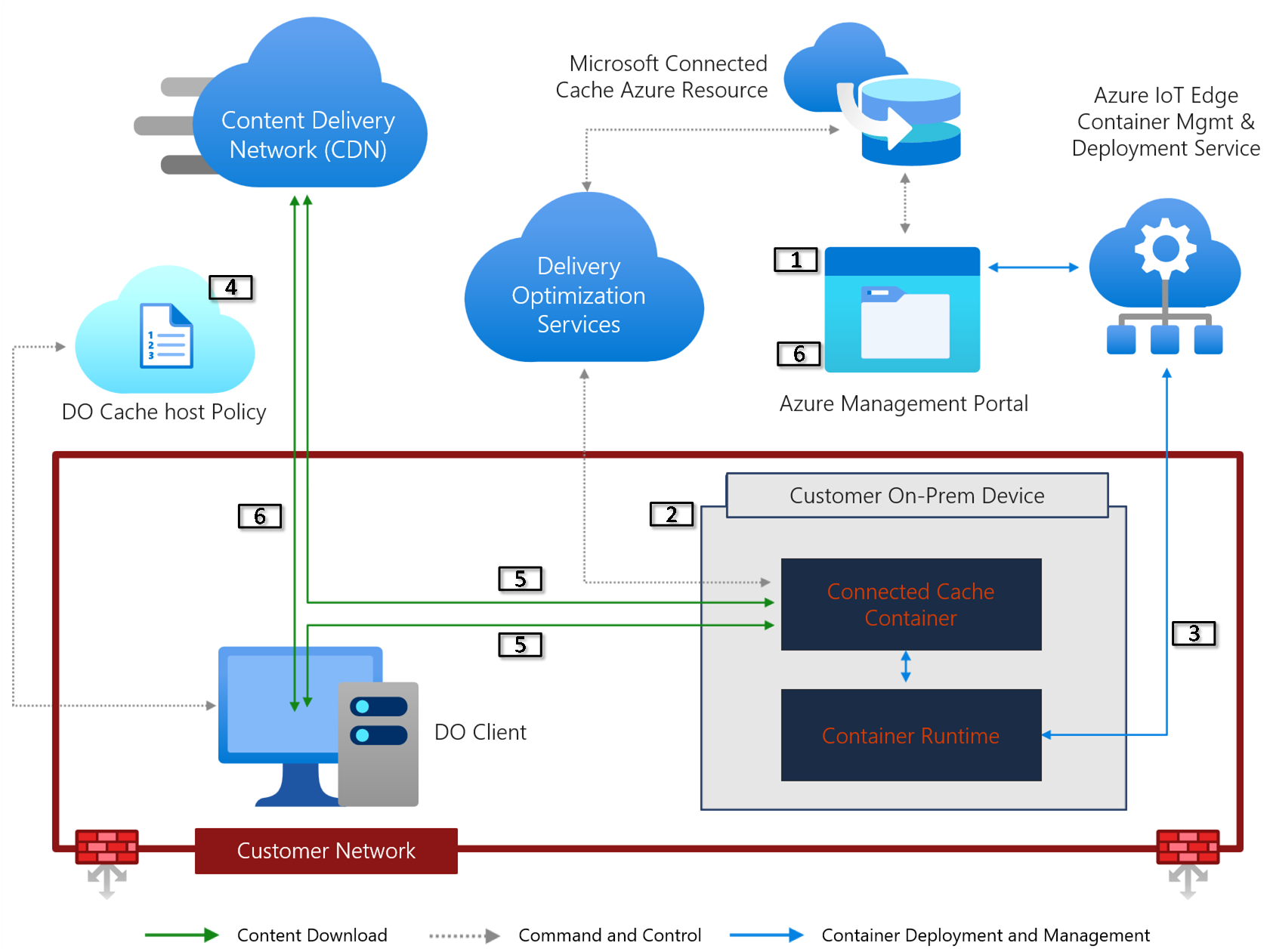 接続済みキャッシュ コンテナーは、Azure IoT Edge コンテナー管理サービスを使用してホスト コンピューターにデプロイされます。 コンテナーのデプロイが成功すると、キャッシュ ノードは配信の最適化サービスに対する状態とメトリックの報告を開始します。