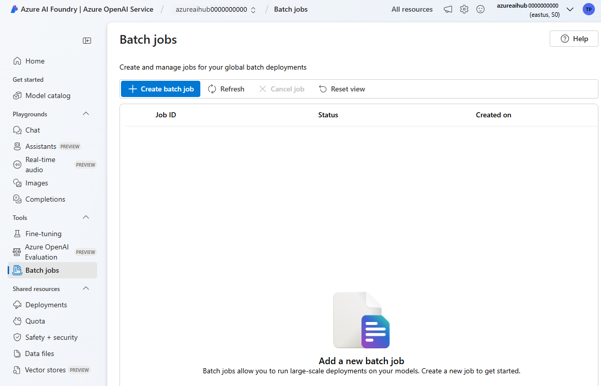 글로벌 일괄 처리 모델 배포가 가능한 Azure OpenAI 리소스를 선택합니다.