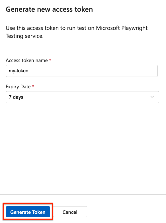 Playwright 작업 영역에 대한 액세스 권한을 부여하고 작업 영역에서 기존 Playwright 테스트를 실행하는 액세스 토큰을 만듭니다. 작업 영역에 대해 여러 액세스 토큰을 만들 수 있습니다. 액세스 토큰을 만들 때 토큰의 만료 날짜를 지정해야 합니다. 토큰이 만료된 후에는 새 액세스 토큰을 만들어야 합니다.
