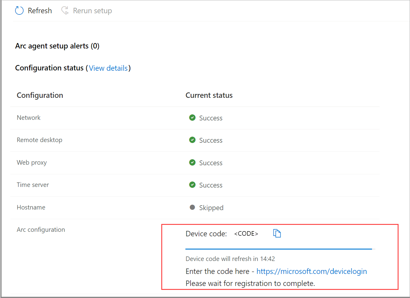 PS C:\Users\Administrator> Invoke-AzStackHciArcInitialization -TenantId $Tenant -SubscriptionID $Subscription -ResourceGroup $RG -Region $Region -Cloud "AzureCloud" -Proxy $ProxyServer >> Configuration saved to: C:\Users\ADMINI~1\AppData\Local\Temp\bootstrap.json Triggering bootstrap on the device... Waiting for bootstrap to complete... Current Status: InProgress =========SNIPPED=========SNIPPED============= Waiting for bootstrap to complete... Current Status: InProgress Waiting for bootstrap to complete... Current Status: Succeeded Bootstrap succeeded. Triggering bootstrap log collection as a best effort. Version Response ------- -------- V1 Microsoft.Azure.Edge.Bootstrap.ServiceContract.Data.Response V1 Microsoft.Azure.Edge.Bootstrap.ServiceContract.Data.Response PS C:\Users\Administrator>Arc 등록 프로세스 중에 Azure 계정으로 인증해야 합니다. 콘솔 창에는 인증하기 위해 앱에 표시되는 URL에 입력해야 하는 코드가 표시됩니다. 지침에 따라 인증 프로세스를 완료합니다.