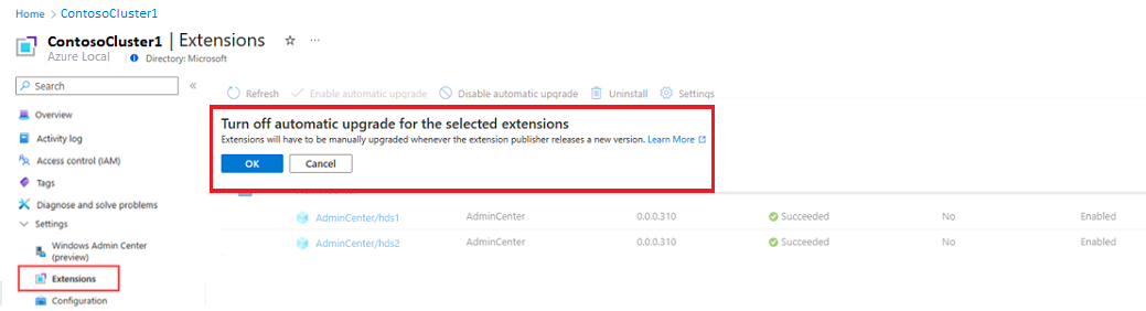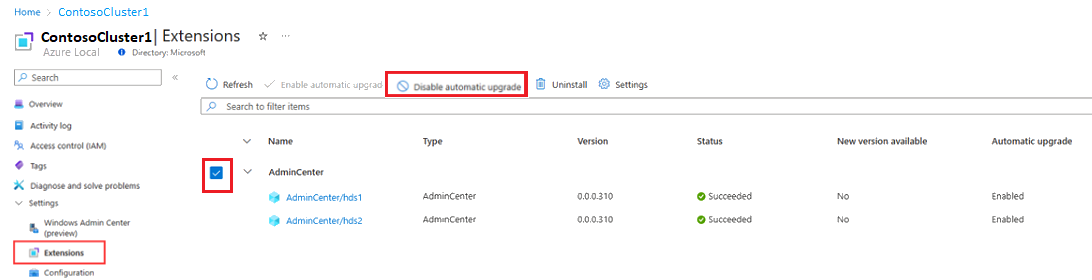 Azure Portal에서 특정 확장에 대해 자동 업그레이드를 사용하지 않도록 설정할 수 있습니다. 자동 업그레이드를 사용하지 않도록 설정하려면 확장 페이지로 이동하여 다음 단계를 수행합니다.