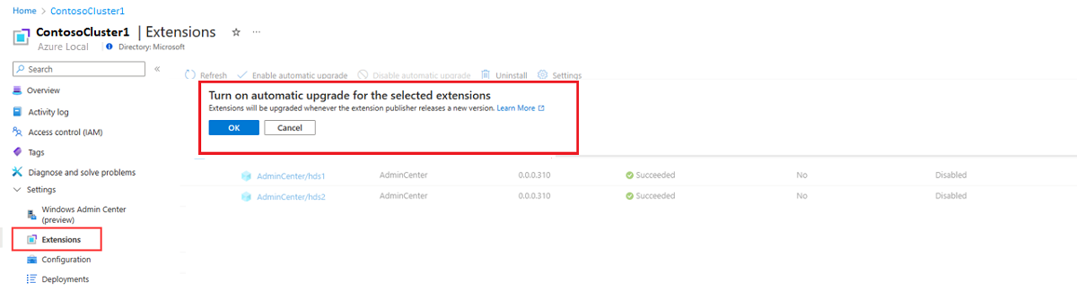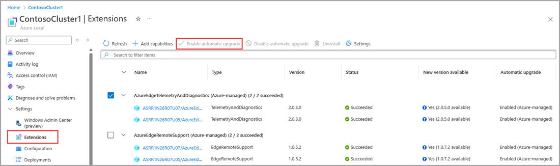 확장 게시자 팀에서 게시하는 경우 확장 업그레이드 프로세스는 기존 확장 버전을 새로 지원되는 확장 버전으로 바꿉니다. 자동 업그레이드를 명시적으로 옵트아웃하지 않는 한 기본적으로 자동 확장 업그레이드 기능은 Azure 로컬 Arc 지원 클러스터에 배포된 모든 확장에 대해 사용하도록 설정됩니다.