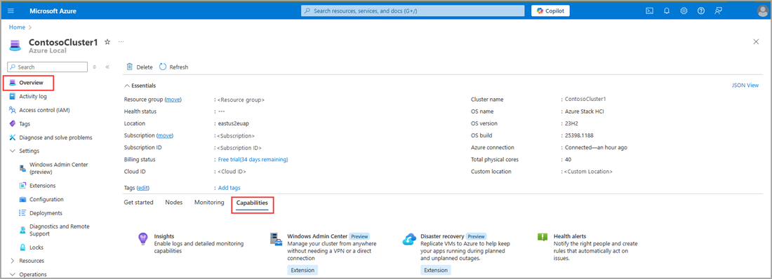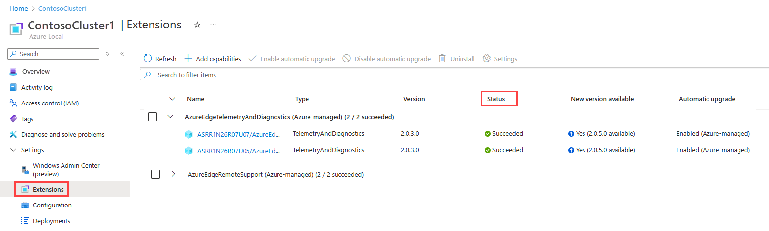 Azure Local에서 Azure Arc 확장을 설치, 제거 및 업데이트할 수 있습니다. Azure Arc를 사용하면 Azure Portal에서 모니터링 및 Windows Admin Center와 같은 하이브리드 서비스를 실행할 수 있습니다.