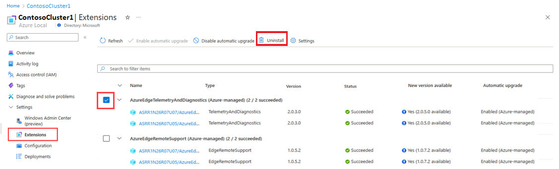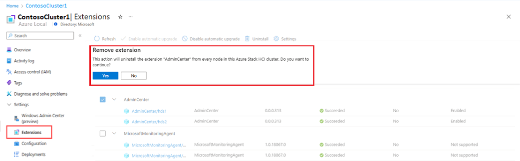 필요한 경우 Azure Portal의 Azure Local에서 일부 확장을 제거할 수 있습니다. 확장을 제거하려면 다음 단계를 사용합니다.