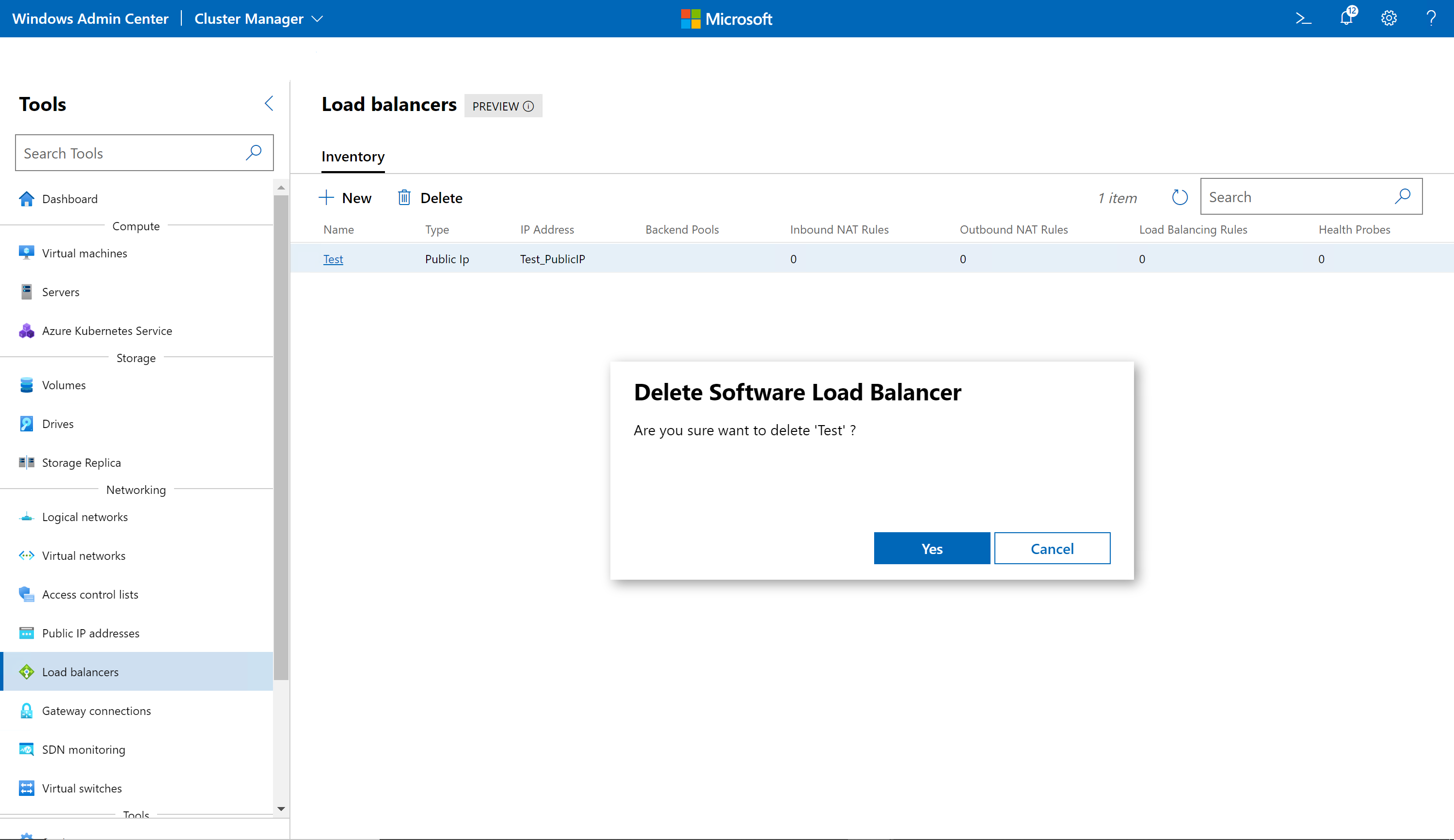 - 확인 대화 상자에서 예를 클릭합니다. 새로 고침을 클릭하여 부하 분산 장치가 삭제되었는지 확인합니다.