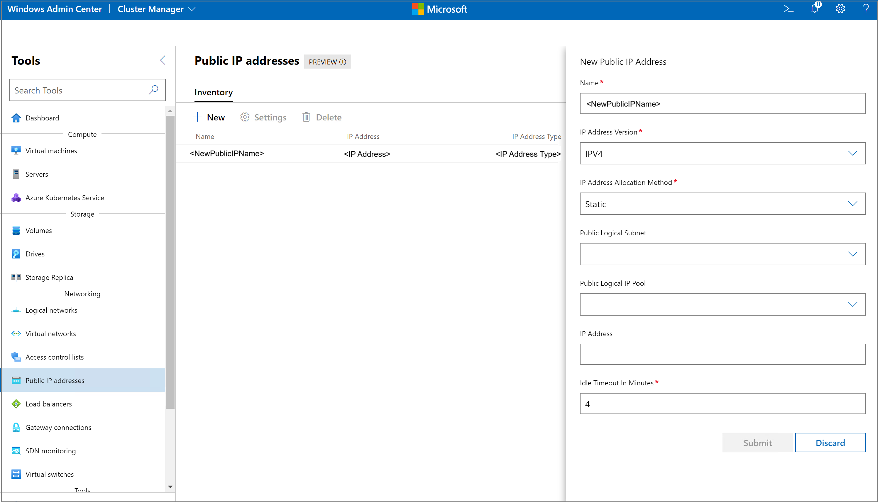 - 공용 VIP를 선택하는 경우 해당 서브넷에서 공용 SDN 논리 네트워크, 논리 네트워크 서브넷 및 공용 VIP IP 주소를 선택합니다.