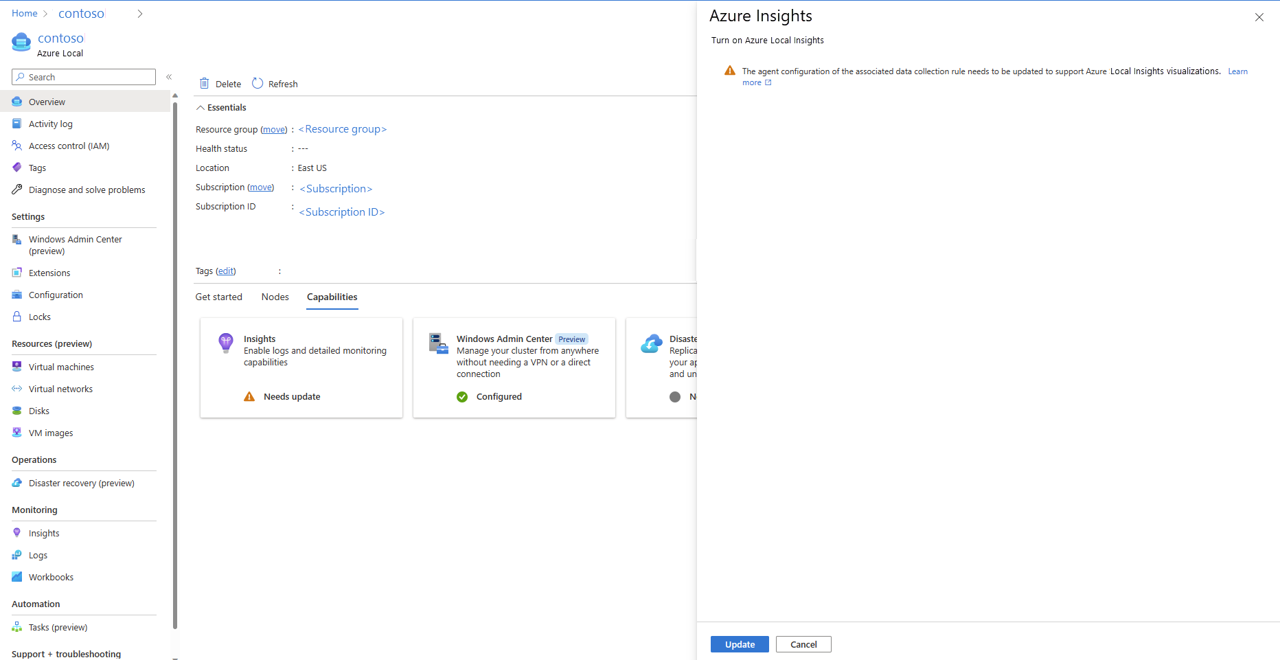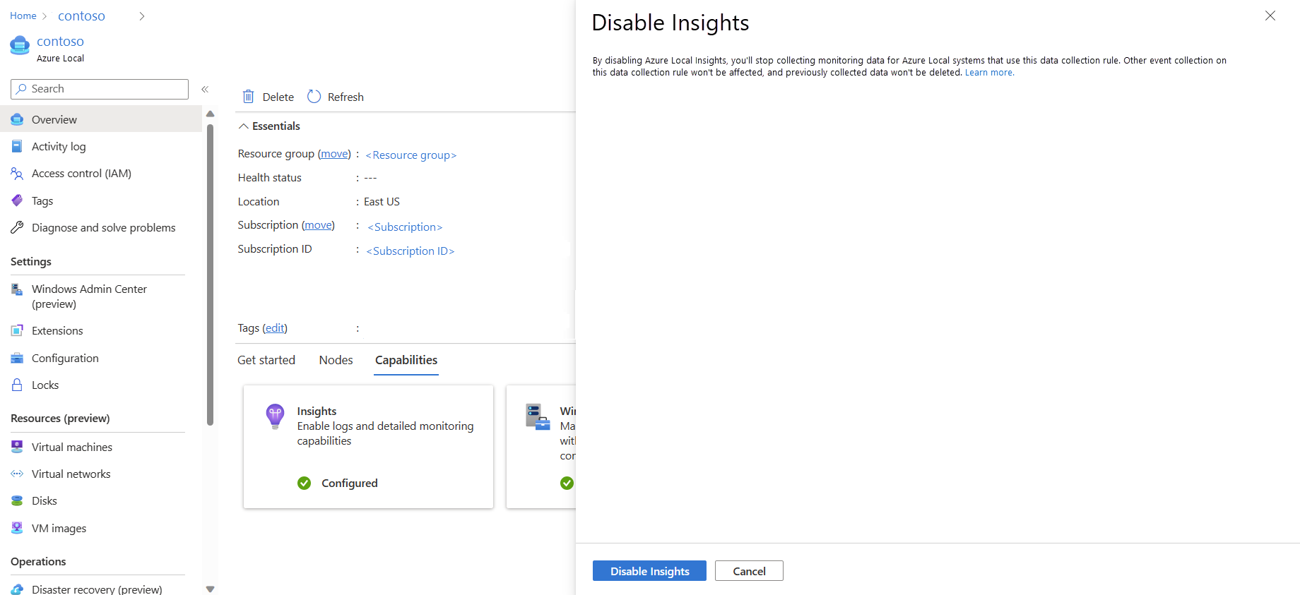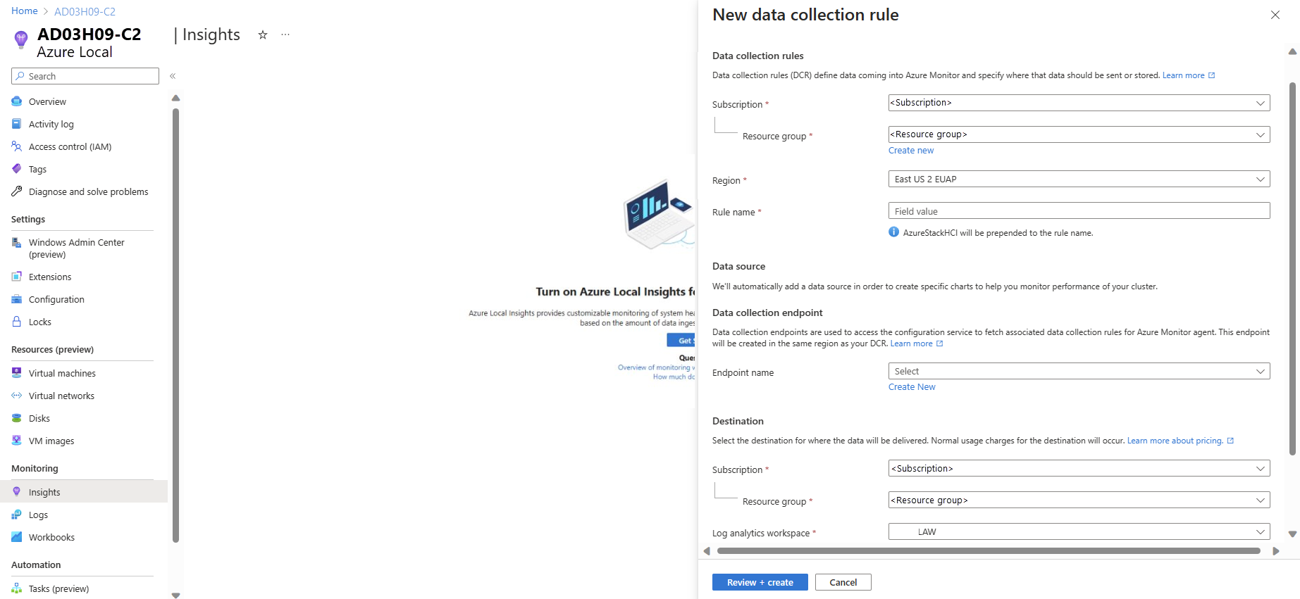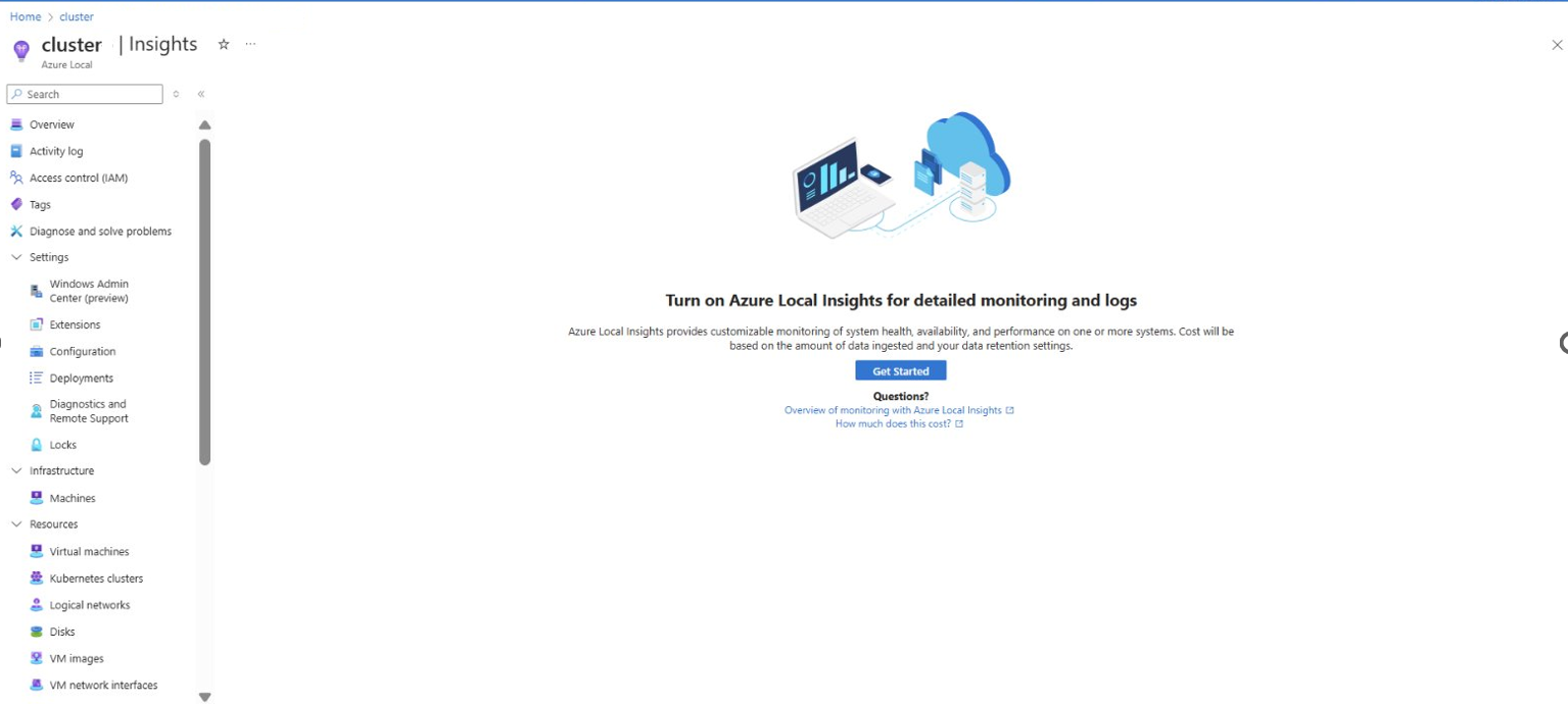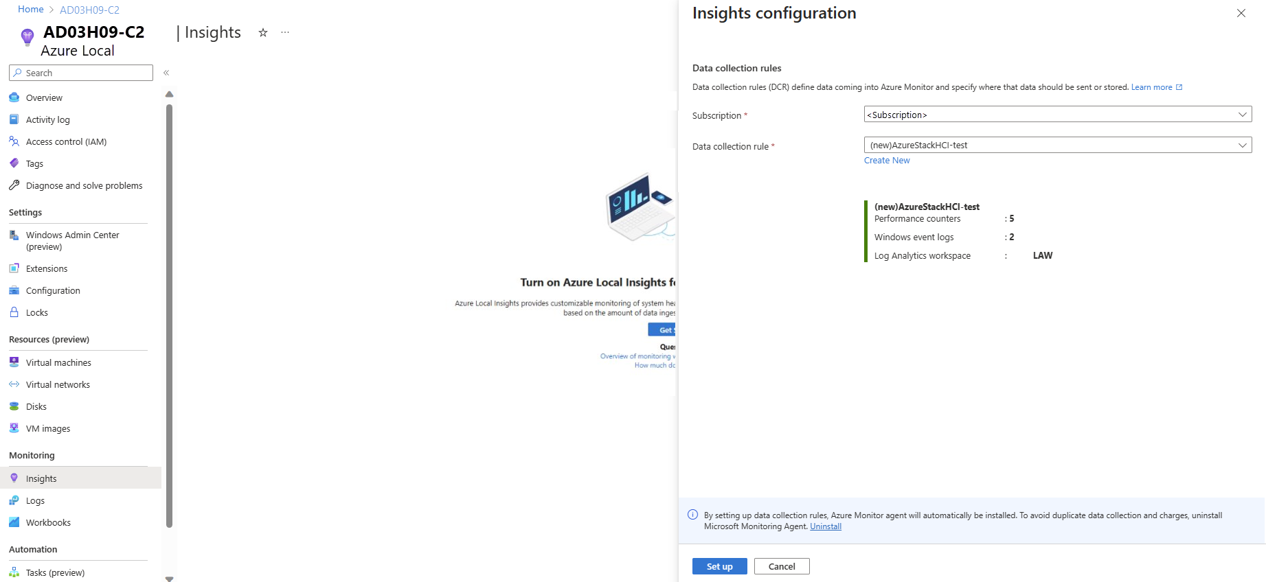 Insights를 사용하도록 설정하면 유용한 상태 메트릭을 제공하여 현재 Log Analytics 작업 영역과 연결된 모든 Azure 로컬 시스템을 모니터링할 수 있습니다. Insights는 Azure Monitor 에이전트를 설치하고 Azure 로컬 시스템을 모니터링하기 위한 DCR(데이터 수집 규칙) 을 구성하는 데 도움이 됩니다.