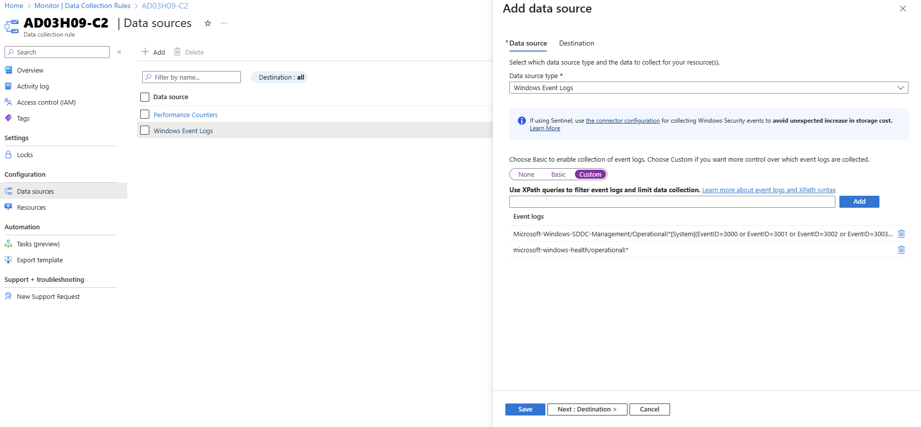 - 연결된 DCR의 구성을 확인합니다. 데이터 수집 규칙 섹션에 설명된 대로 이벤트 채널 및 성능 카운터가 연결된 DCR에 데이터 원본으로 추가되었는지 확인합니다.