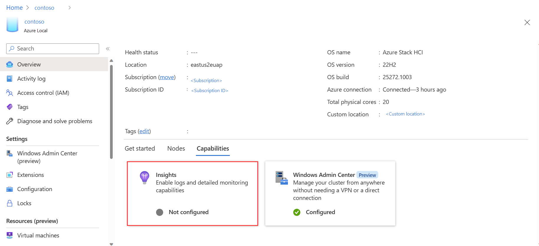 Azure Portal에서 Azure 로컬 리소스 페이지로 이동한 다음 시스템을 선택합니다. 기능 탭에서 인사이트를 선택합니다.